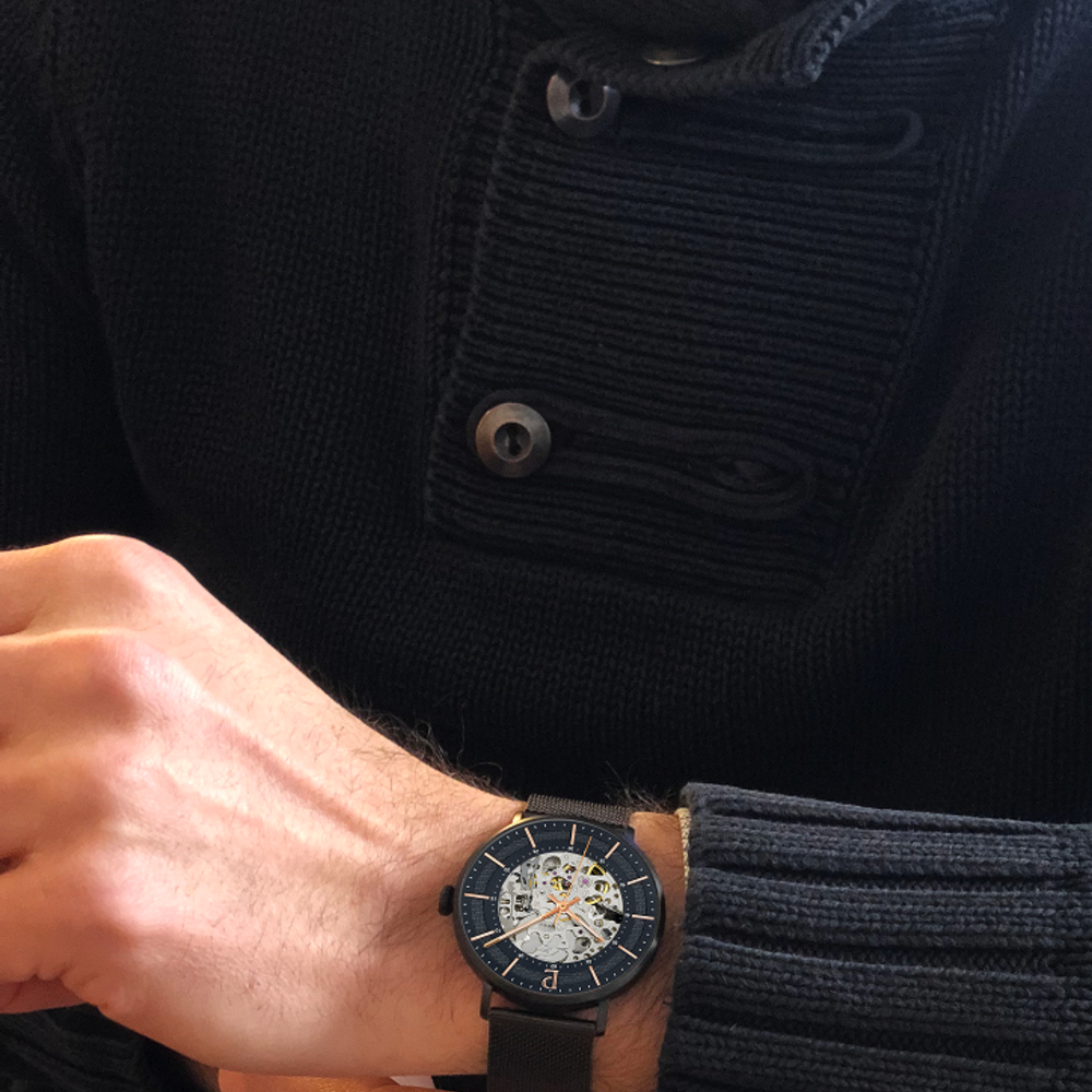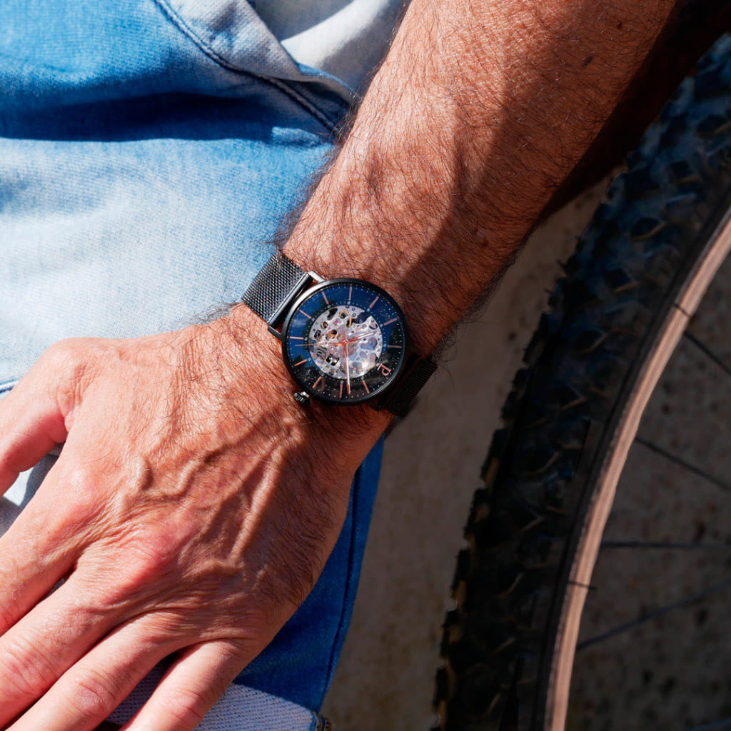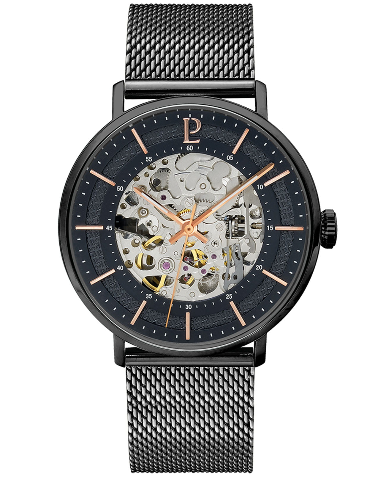 Мужские механические часы с автоподзаводом Pierre Lannier Gaius 324C439. Минеральное стеклоМинеральное стеклоМинеральное стекло представляет собой искусственно выращенный минерал кварца. Такое стекло отличается особой устойчивостью к повреждениям и царапинам. Уступает по некоторым качествам сапфировому стеклу. устойчивое к мелким механическим повреждениям. Центральные часовая, минутная и секундная стрелки. Корпус и браслет выполнен из нержавеющей стали с IP-покрытиемIP-покрытиеМетод ионного напыления. Демонстрирует повышенную устойчивость к истиранию, окислению и химическим веществам. Под воздействием высокого давления и температуры около 1500°C молекулы металла надёжно соединяются с частицами корпуса часов.. Водостойкость: 50 метров, позволит защитить корпус от случайных брызг или капель дождя. Браслет миланского плетения с раскладной застёжкойРаскладная застёжкаТакой тип застёжки используется только на браслетах из металла. Она никогда не раскрывается полностью, происходит разделение на 2 и более частей. Раскладывающая застёжка снизит вероятность потери часов к минимуму.. Стрелки с люминесцентным покрытиемЛюминесцентное покрытиеПозволяет считывать показания времени в темноте. Производители наносят на стрелки, часовые индексы, безель или поверхность циферблата светонакопительный состав, дающий холодное свечение.. Прозрачная задняя крышка.