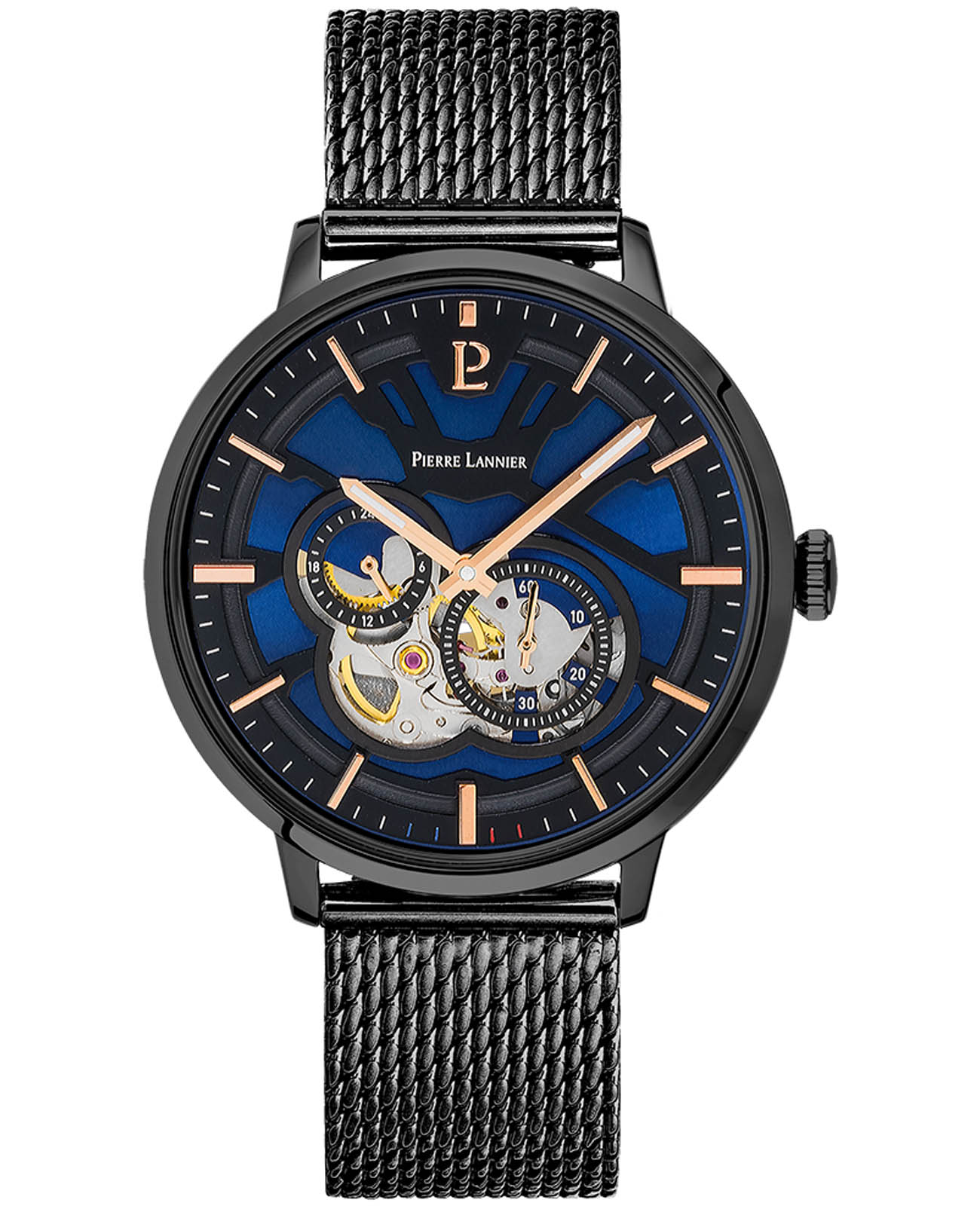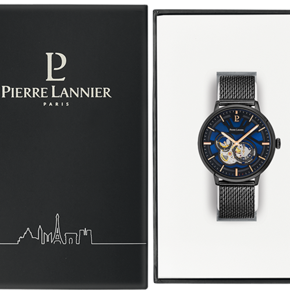 Мужские механические часы с автоподзаводом Pierre Lannier Trio 335B469. Минеральное стеклоМинеральное стеклоМинеральное стекло представляет собой искусственно выращенный минерал кварца. Такое стекло отличается особой устойчивостью к повреждениям и царапинам. Уступает по некоторым качествам сапфировому стеклу. устойчивое к мелким механическим повреждениям. 12/24х часовой формат времени. Центральные часовая и минутная стрелки, секундная стрелка вынесена на малый циферблат. Корпус выполнен из нержавеющей стали с IP-покрытиемIP-покрытиеМетод ионного напыления. Демонстрирует повышенную устойчивость к истиранию, окислению и химическим веществам. Под воздействием высокого давления и температуры около 1500°C молекулы металла надёжно соединяются с частицами корпуса часов.. Водостойкость: 50 метров, позволит защитить корпус от случайных брызг или капель дождя. Стальной браслет миланского плетения с раскладной застёжкойРаскладная застёжкаТакой тип застёжки используется только на браслетах из металла. Она никогда не раскрывается полностью, происходит разделение на 2 и более частей. Раскладывающая застёжка снизит вероятность потери часов к минимуму.. Синий циферблат с открытым балансом хода. Стрелки с люминесцентным покрытиемЛюминесцентное покрытиеПозволяет считывать показания времени в темноте. Производители наносят на стрелки, часовые индексы, безель или поверхность циферблата светонакопительный состав, дающий холодное свечение..