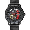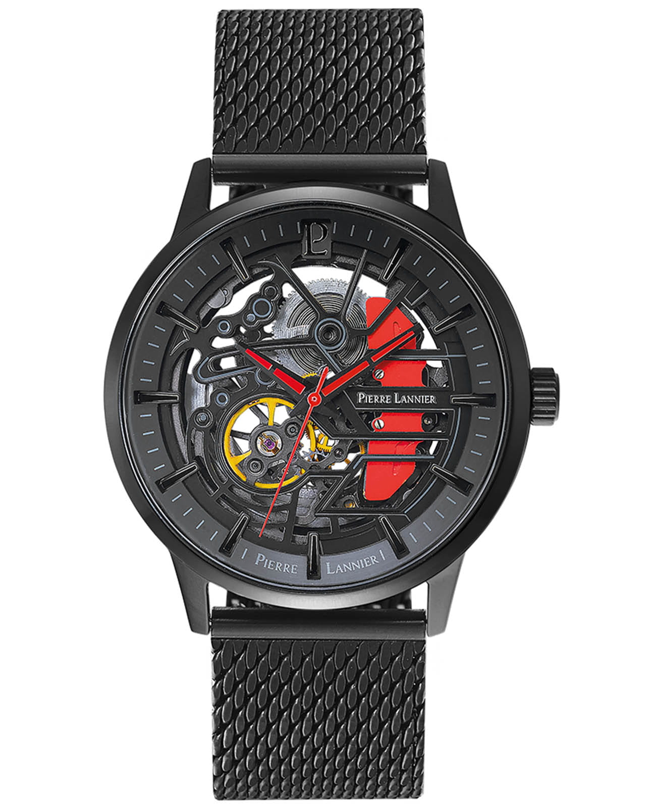 Мужские механические часы с автоподзаводом Pierre Lannier Paddock 338A439. Минеральное стеклоМинеральное стеклоМинеральное стекло представляет собой искусственно выращенный минерал кварца. Такое стекло отличается особой устойчивостью к повреждениям и царапинам. Уступает по некоторым качествам сапфировому стеклу. устойчивое к мелким механическим повреждениям. Центральные часовая, минутная и секундная стрелки. Корпус выполнен из нержавеющей стали с IP-покрытиемIP-покрытиеМетод ионного напыления. Демонстрирует повышенную устойчивость к истиранию, окислению и химическим веществам. Под воздействием высокого давления и температуры около 1500°C молекулы металла надёжно соединяются с частицами корпуса часов.. Водостойкость: 50 метров, позволит защитить корпус от случайных брызг или капель дождя. Стальной браслет миланского плетения с раскладной застёжкойРаскладная застёжкаТакой тип застёжки используется только на браслетах из металла. Она никогда не раскрывается полностью, происходит разделение на 2 и более частей. Раскладывающая застёжка снизит вероятность потери часов к минимуму.. Черный скелетонизированный циферблат.