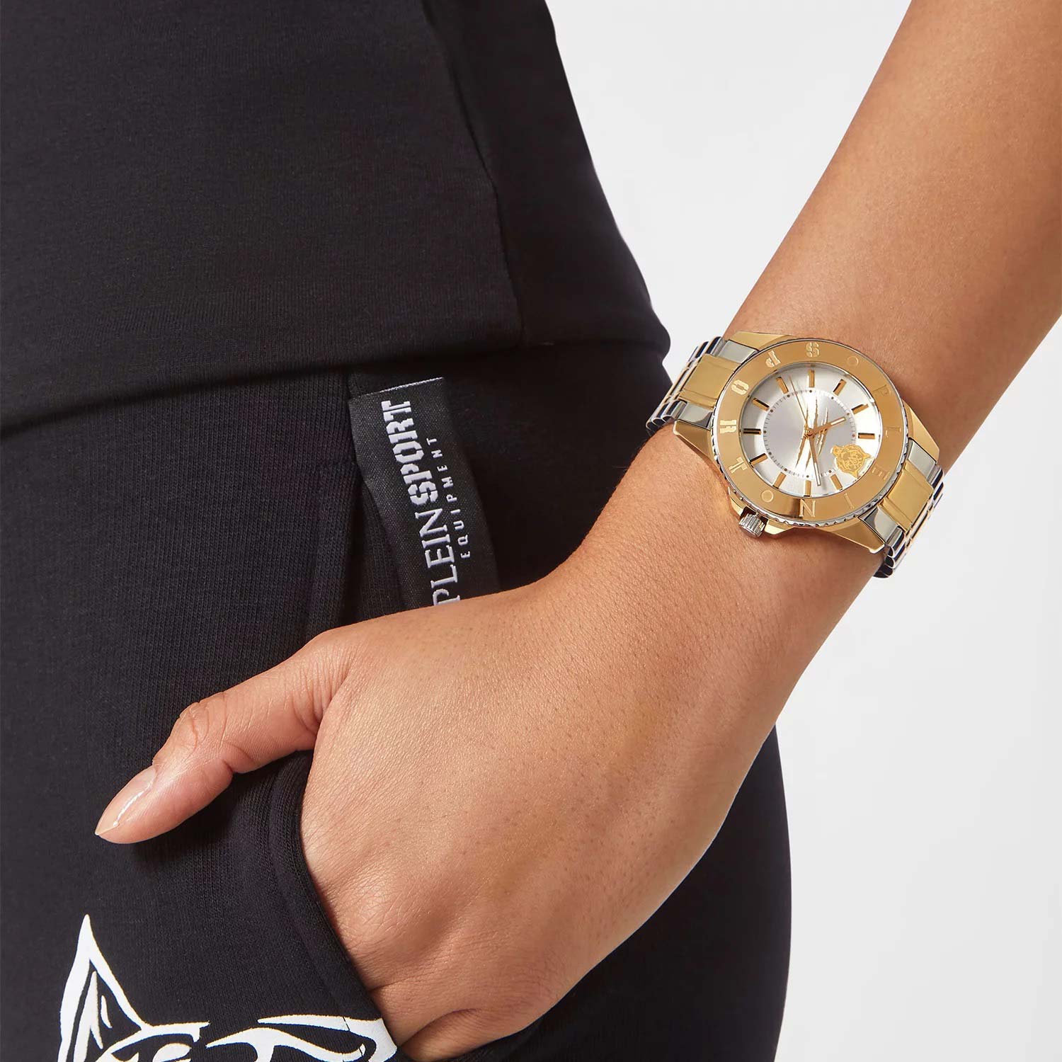 Немецкие женские кварцевые часы с минеральным стекломМинеральное стеклоМинеральное стекло представляет собой искусственно выращенный минерал кварца. Такое стекло отличается особой устойчивостью к повреждениям и царапинам. Уступает по некоторым качествам сапфировому стеклу. Plein Sport Glam PSKBA0823, кварцевый механизм с высокой точностью. Класс водозащиты: 50 метров, позволит защитить корпус от случайных брызг или капель дождя. Корпус часов изготовлен из стали с IP-покрытиемIP-покрытиеМетод ионного напыления. Демонстрирует повышенную устойчивость к истиранию, окислению и химическим веществам. Под воздействием высокого давления и температуры около 1500°C молекулы металла надёжно соединяются с частицами корпуса часов.. Стальной браслет на раскладной застёжкеРаскладная застёжкаТакой тип застёжки используется только на браслетах из металла. Она никогда не раскрывается полностью, происходит разделение на 2 и более частей. Раскладывающая застёжка снизит вероятность потери часов к минимуму. с IP-покрытиемIP-покрытиеМетод ионного напыления. Демонстрирует повышенную устойчивость к истиранию, окислению и химическим веществам. Под воздействием высокого давления и температуры около 1500°C молекулы металла надёжно соединяются с частицами корпуса часов.. Стрелки с люминесцентным покрытиемЛюминесцентное покрытиеПозволяет считывать показания времени в темноте. Производители наносят на стрелки, часовые индексы, безель или поверхность циферблата светонакопительный состав, дающий холодное свечение..