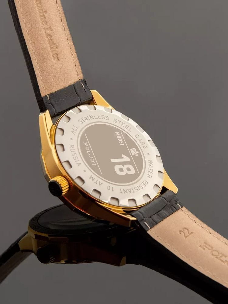 Poljot NH35A.186264 — надёжные механические мужские часы с автоподзаводом, сочетающие техническую точность и выразительный спортивный стиль. Корпус из нержавеющей стали  с PVD-покрытиемPVDУльтратонкое покрытие наносится в технике вакуумного напыления, сочетает в себе нитрид титана особой прочности со слоем золота или оксида хрома. Несёт в себе декоративную или защитную функцию. подчёркивает прочность конструкции, а насыщенный циферблат с акцентами на стрелках и метках придаёт модели динамичный и современный облик. БезельБезельВнешний ободок, закрепляющий стекло. В спортивных часах так называется поворотное кольцо с делениями на циферблате, выполняет роль таймера – замеряет отрезки времени на шкале. Неподвижный безель – элемент декора. Однонаправленно вращающийся безель на дайверских часах позволяет фиксировать моменты погружения и выныривания на поверхность. с PVD-покрытиемPVDУльтратонкое покрытие наносится в технике вакуумного напыления, сочетает в себе нитрид титана особой прочности со слоем золота или оксида хрома. Несёт в себе декоративную или защитную функцию.. Внутри установлен проверенный японский механизм SEIKO NH35, обеспечивающий стабильную работу и плавный ход секундной стрелки. Окно даты добавляет функциональности, а широкие метки с люминесцентным покрытиемЛюминесцентное покрытиеПозволяет считывать показания времени в темноте. Производители наносят на стрелки, часовые индексы, безель или поверхность циферблата светонакопительный состав, дающий холодное свечение. обеспечивают отличную читаемость даже в темноте. Прочное минеральное стеклоМинеральное стеклоМинеральное стекло представляет собой искусственно выращенный минерал кварца. Такое стекло отличается особой устойчивостью к повреждениям и царапинам. Уступает по некоторым качествам сапфировому стеклу. защищает циферблат от царапин, а ремешок из натуральной кожи с контрастной прострочкой гарантирует комфорт и надёжную посадку. Poljot — часы с характером, созданные для тех, кто ценит точность, качество и спортивную уверенность в каждой детали.