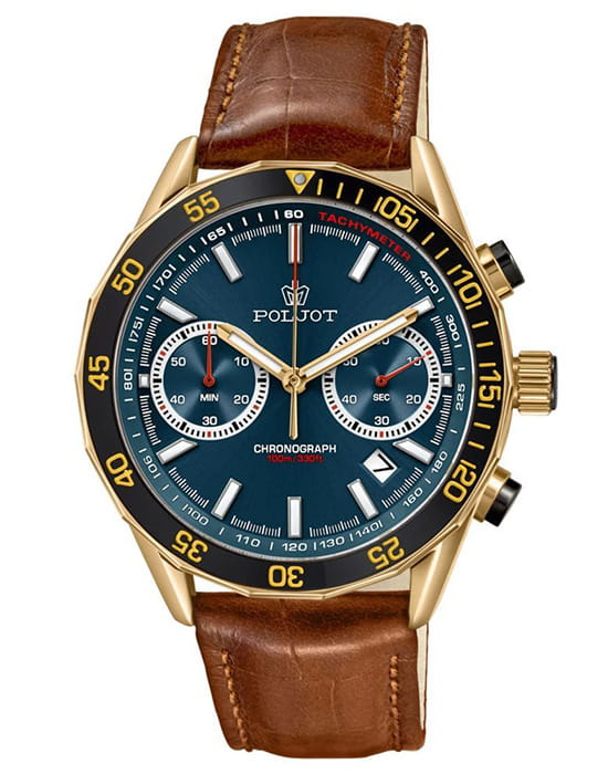 Poljot 6S21.186258 — яркие мужские часы с выразительным спортивным характером и акцентом на функциональность. Корпус из нержавеющей стали с PVD-покрытиемPVDУльтратонкое покрытие наносится в технике вакуумного напыления, сочетает в себе нитрид титана особой прочности со слоем золота или оксида хрома. Несёт в себе декоративную или защитную функцию. придаёт модели надёжность и солидность, а насыщенный циферблат с контрастными счётчиками хронографаХронографФункция позволяет измерять отрезки времени с особой точностью: часы, минуты, секунды. Верным признаком хронографа является наличие на циферблате 3 дополнительных окошек-счётчиков. создаёт динамичный и энергичный облик. БезельБезельВнешний ободок, закрепляющий стекло. В спортивных часах так называется поворотное кольцо с делениями на циферблате, выполняет роль таймера – замеряет отрезки времени на шкале. Неподвижный безель – элемент декора. Однонаправленно вращающийся безель на дайверских часах позволяет фиксировать моменты погружения и выныривания на поверхность. с PVD-покрытиемPVDУльтратонкое покрытие наносится в технике вакуумного напыления, сочетает в себе нитрид титана особой прочности со слоем золота или оксида хрома. Несёт в себе декоративную или защитную функцию.. Широкие стрелки и метки с люминесцентным покрытиемЛюминесцентное покрытиеПозволяет считывать показания времени в темноте. Производители наносят на стрелки, часовые индексы, безель или поверхность циферблата светонакопительный состав, дающий холодное свечение. обеспечивают отличную читаемость в любых условиях, а внешний обод с минутной шкалой подчёркивает спортивный стиль. Окно даты добавляет практичности. Прочное минеральное стеклоМинеральное стеклоМинеральное стекло представляет собой искусственно выращенный минерал кварца. Такое стекло отличается особой устойчивостью к повреждениям и царапинам. Уступает по некоторым качествам сапфировому стеклу. надёжно защищает циферблат от повреждений, а ремешок из натуральной кожи гармонично дополняет контрастную цветовую палитру. Poljot — это смелое сочетание спортивной энергии, точности и современного дизайна для активного и уверенного мужчины.