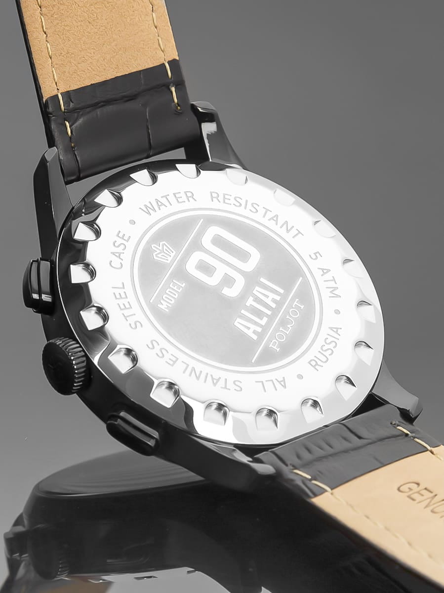 Poljot 6S21.904212 — современные мужские часы с выразительным спортивным дизайном и надёжной функциональностью. Корпус из нержавеющей стали с с PVD-покрытиемPVDУльтратонкое покрытие наносится в технике вакуумного напыления, сочетает в себе нитрид титана особой прочности со слоем золота или оксида хрома. Несёт в себе декоративную или защитную функцию. подчёркивает прочность и уверенный характер модели, а глубокий циферблат с счётчиками хронографаХронографФункция позволяет измерять отрезки времени с особой точностью: часы, минуты, секунды. Верным признаком хронографа является наличие на циферблате 3 дополнительных окошек-счётчиков. и аккуратным окном даты на позиции «6 часов» придаёт часам динамичный вид. Контрастные стрелки и метки с люминесцентным покрытиемЛюминесцентное покрытиеПозволяет считывать показания времени в темноте. Производители наносят на стрелки, часовые индексы, безель или поверхность циферблата светонакопительный состав, дающий холодное свечение. обеспечивают удобство считывания информации в любое время суток, а внешняя шкала тахиметраТахиметрРазмеченная шкала, располагается на ободке или безеле часов. Тахиметр позволяет рассчитать скорость на определённом участке пути, расстояние измеряется в километрах или милях. добавляет спортивную функциональность. Прочное минеральное стеклоМинеральное стеклоМинеральное стекло представляет собой искусственно выращенный минерал кварца. Такое стекло отличается особой устойчивостью к повреждениям и царапинам. Уступает по некоторым качествам сапфировому стеклу. защищает циферблат от царапин, а ремешок из натуральной кожи гарантирует комфорт и элегантную посадку на запястье. Poljot — это гармония классики и спортивного духа, созданная для мужчин, ценящих точность, надёжность и уверенный стиль.