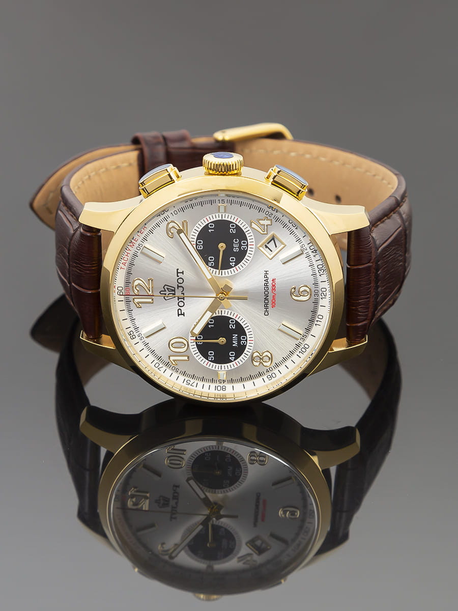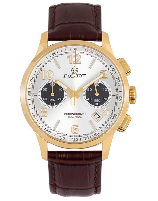 Poljot 6S21.906215 — современные мужские часы с выразительным спортивным дизайном и надёжной функциональностью. Корпус из нержавеющей стали с с PVD-покрытиемPVDУльтратонкое покрытие наносится в технике вакуумного напыления, сочетает в себе нитрид титана особой прочности со слоем золота или оксида хрома. Несёт в себе декоративную или защитную функцию. подчёркивает прочность и уверенный характер модели, а глубокий циферблат с счётчиками хронографаХронографФункция позволяет измерять отрезки времени с особой точностью: часы, минуты, секунды. Верным признаком хронографа является наличие на циферблате 3 дополнительных окошек-счётчиков. и аккуратным окном даты придаёт часам динамичный вид. Контрастные стрелки и метки с люминесцентным покрытиемЛюминесцентное покрытиеПозволяет считывать показания времени в темноте. Производители наносят на стрелки, часовые индексы, безель или поверхность циферблата светонакопительный состав, дающий холодное свечение. обеспечивают удобство считывания информации в любое время суток, а внешняя шкала тахиметраТахиметрРазмеченная шкала, располагается на ободке или безеле часов. Тахиметр позволяет рассчитать скорость на определённом участке пути, расстояние измеряется в километрах или милях. добавляет спортивную функциональность. Прочное минеральное стеклоМинеральное стеклоМинеральное стекло представляет собой искусственно выращенный минерал кварца. Такое стекло отличается особой устойчивостью к повреждениям и царапинам. Уступает по некоторым качествам сапфировому стеклу. защищает циферблат от царапин, а ремешок из натуральной кожи гарантирует комфорт и элегантную посадку на запястье. Poljot — это гармония классики и спортивного духа, созданная для мужчин, ценящих точность, надёжность и уверенный стиль.