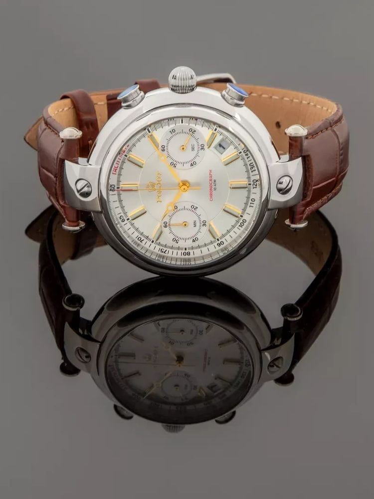 Poljot 6S21.961228 “Baikal” — элегантные кварцевые мужские часы, в которых классическая строгость сочетается с выразительным российским характером. Корпус из нержавеющей стали с крупными декоративными ушками придаёт модели солидность и узнаваемость, а глубокий циферблат с контрастными стрелками и индексами с люминесцентным покрытиемЛюминесцентное покрытиеПозволяет считывать показания времени в темноте. Производители наносят на стрелки, часовые индексы, безель или поверхность циферблата светонакопительный состав, дающий холодное свечение. подчёркивает точность и функциональность. Два дополнительных счётчика хронографаХронографФункция позволяет измерять отрезки времени с особой точностью: часы, минуты, секунды. Верным признаком хронографа является наличие на циферблате 3 дополнительных окошек-счётчиков. обеспечивают измерение времени с высокой точностью, а окно даты добавляет практичности. Прочное минеральное стеклоМинеральное стеклоМинеральное стекло представляет собой искусственно выращенный минерал кварца. Такое стекло отличается особой устойчивостью к повреждениям и царапинам. Уступает по некоторым качествам сапфировому стеклу. защищает циферблат от царапин, а ремешок из натуральной кожи с классической пряжкой гарантирует комфорт и надёжную фиксацию на запястье. Poljot “Baikal” — это сочетание традиций, надёжности и уверенного стиля, созданное для мужчин, ценящих точность и благородную сдержанность.