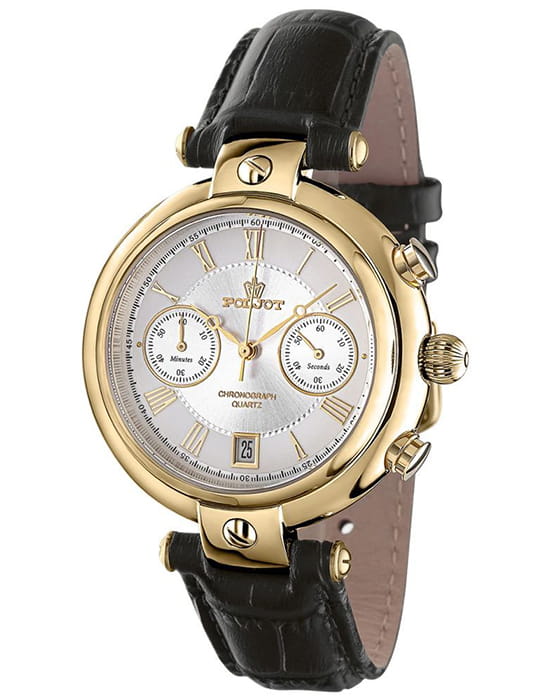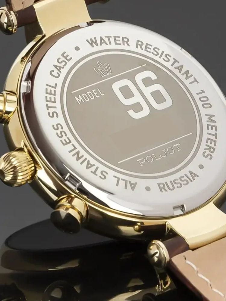 Poljot 6S21.966054 “Baikal” — элегантные кварцевые мужские часы, в которых классическая строгость сочетается с выразительным российским характером. Корпус из нержавеющей стали с PVD-покрытиемPVDУльтратонкое покрытие наносится в технике вакуумного напыления, сочетает в себе нитрид титана особой прочности со слоем золота или оксида хрома. Несёт в себе декоративную или защитную функцию. с крупными декоративными ушками придаёт модели солидность и узнаваемость, а глубокий циферблат с контрастными стрелками и индексами подчёркивает точность и функциональность. Два дополнительных счётчика хронографаХронографФункция позволяет измерять отрезки времени с особой точностью: часы, минуты, секунды. Верным признаком хронографа является наличие на циферблате 3 дополнительных окошек-счётчиков. обеспечивают измерение времени с высокой точностью, а окно даты добавляет практичности. Прочное минеральное стеклоМинеральное стеклоМинеральное стекло представляет собой искусственно выращенный минерал кварца. Такое стекло отличается особой устойчивостью к повреждениям и царапинам. Уступает по некоторым качествам сапфировому стеклу. защищает циферблат от царапин, а ремешок из натуральной кожи с классической пряжкой гарантирует комфорт и надёжную фиксацию на запястье. Poljot “Baikal” — это сочетание традиций, надёжности и уверенного стиля, созданное для мужчин, ценящих точность и благородную сдержанность.