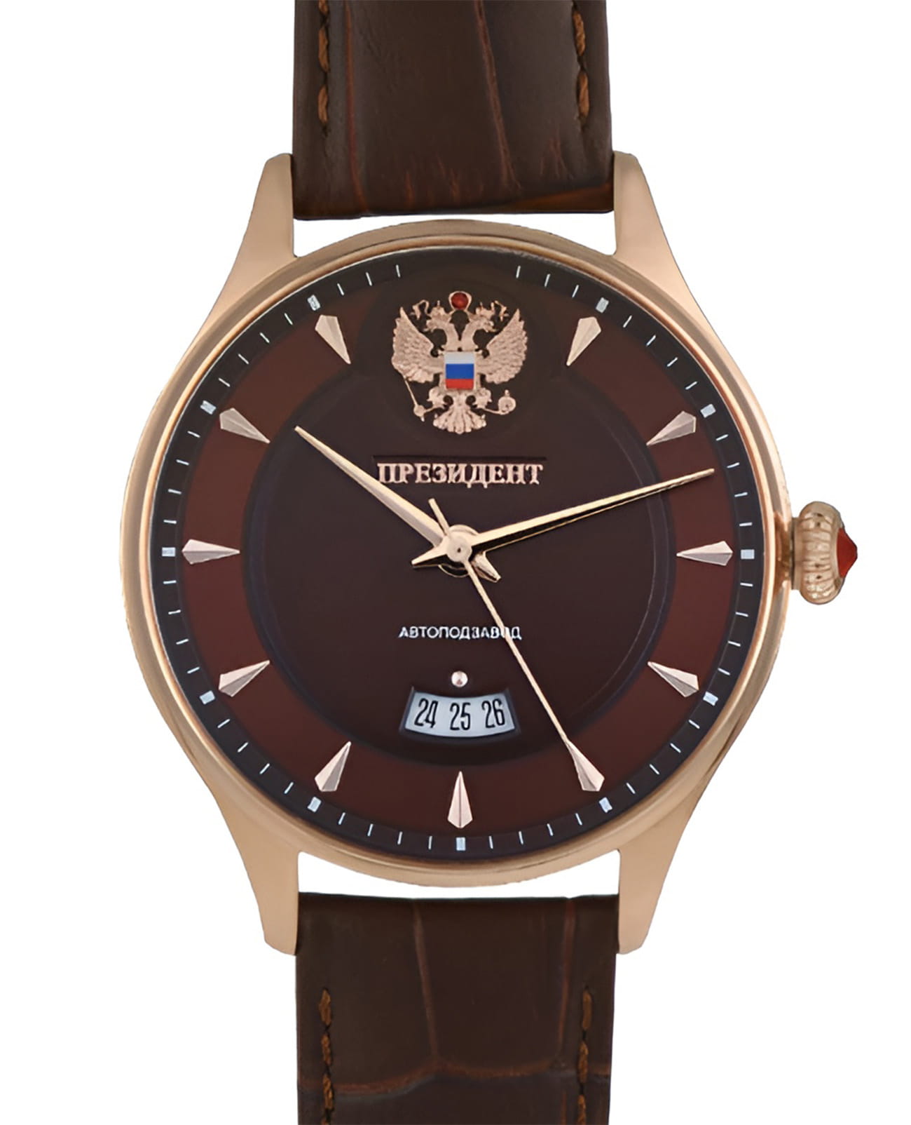 Мужские часы из коллекции «Президент» — это воплощение респектабельности и классического стиля. Модель выполнена в круглой форме с корпусом диаметром 42,2 мм и толщиной 13,8 мм, защищённым минеральным стекломМинеральное стеклоМинеральное стекло представляет собой искусственно выращенный минерал кварца. Такое стекло отличается особой устойчивостью к повреждениям и царапинам. Уступает по некоторым качествам сапфировому стеклу., устойчивым к мелким механическим повреждениям. Цвет корпуса — розовое золото, что придаёт модели благородный внешний вид и подчёркивает её уникальность. Часы оснащены функцией отображения даты и прозрачной задней крышкой, через которую можно наблюдать за работой механизма. На циферблате инкрустированы кристаллы Swarovski, добавляющие модели изысканности и блеска. Браслет коричневого цвета выполнен из натуральной кожи, а его ширина составляет 20 мм, что делает модель удобной и элегантной на запястье. Механизм с автоподзаводом обеспечивает надёжную работу и точность хода. Часы водонепроницаемы до 30 метров (), что позволяет использовать их в повседневных условиях — при мытье рук или под лёгким дождём. Эти часы станут универсальным аксессуаром для тех, кто ценит сочетание стиля, качества и эстетики — идеальный выбор для уверенных в себе мужчин, следящих за своим имиджем и предпочитающих выделяться.