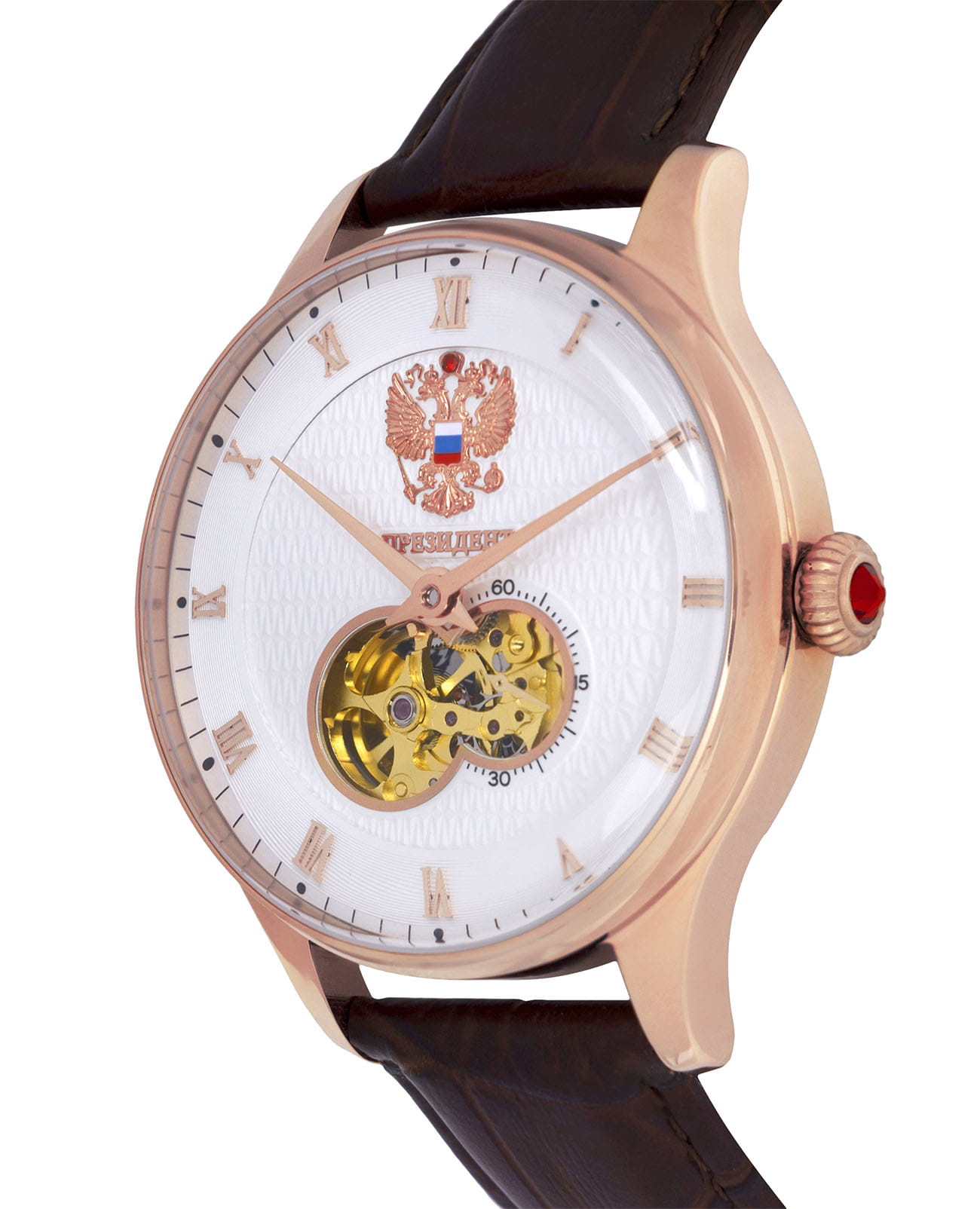 Мужские часы из коллекции «Президент» — это классический аксессуар, сочетающий в себе элегантность и надёжность. Модель выполнена в круглой форме с корпусом диаметром 42,5 мм и толщиной 16,3 мм, защищённым минеральным стекломМинеральное стеклоМинеральное стекло представляет собой искусственно выращенный минерал кварца. Такое стекло отличается особой устойчивостью к повреждениям и царапинам. Уступает по некоторым качествам сапфировому стеклу., устойчивым к мелким повреждениям. Браслет коричневого цвета изготовлен из натуральной кожи и дополнен стандартной застёжкой, что делает его удобным и практичным для повседневного использования. Часы оснащены механизмом с автоподзаводом, обеспечивающим точность хода и минимальное обслуживание. Прозрачная задняя крышка украшена изображением Герба России, что подчёркивает национальную принадлежность и уникальность модели. Водонепроницаемость позволяет использовать модель в повседневных условиях — при мытье рук или под лёгким дождём. Эти часы станут универсальным аксессуаром для тех, кто ценит сочетание стиля, качества и символики — идеальный выбор для уверенных в себе мужчин, следящих за своим имиджем и предпочитающих выделяться.