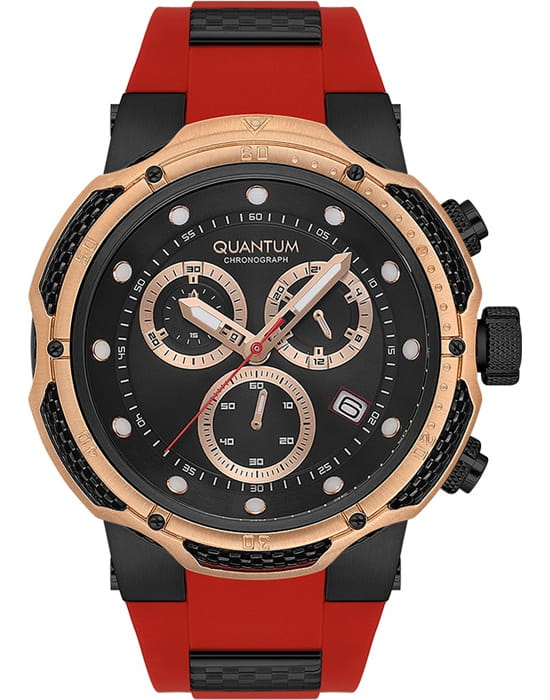 Мужские наручные часы-хронографХронографФункция позволяет измерять отрезки времени с особой точностью: часы, минуты, секунды. Верным признаком хронографа является наличие на циферблате 3 дополнительных окошек-счётчиков. Quantum HNG1051.858, кварцевый механизм с высокой точностью. Минеральное стеклоМинеральное стеклоМинеральное стекло представляет собой искусственно выращенный минерал кварца. Такое стекло отличается особой устойчивостью к повреждениям и царапинам. Уступает по некоторым качествам сапфировому стеклу. устойчивое к появлению царапин, обладающее высокой прозрачностью. Класс водозащиты: 100 метров, позволит плавать, нырять и заниматься другими водными видами спорта. Корпус часов изготовлен из стали с PVD-покрытиемPVDУльтратонкое покрытие наносится в технике вакуумного напыления, сочетает в себе нитрид титана особой прочности со слоем золота или оксида хрома. Несёт в себе декоративную или защитную функцию.. Стрелки с люминесцентным покрытиемЛюминесцентное покрытиеПозволяет считывать показания времени в темноте. Производители наносят на стрелки, часовые индексы, безель или поверхность циферблата светонакопительный состав, дающий холодное свечение.. Каучуковый ремешок.
