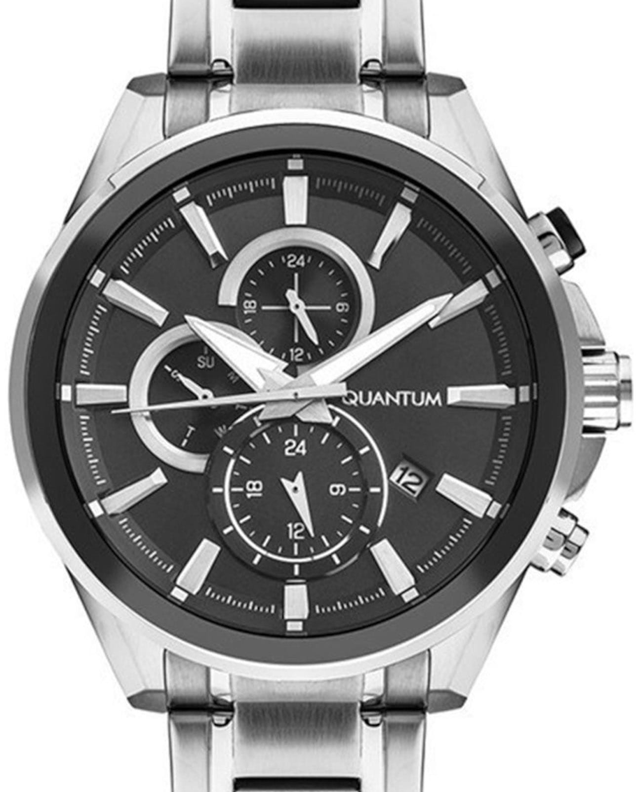 Мужские наручные часы-хронографХронографФункция позволяет измерять отрезки времени с особой точностью: часы, минуты, секунды. Верным признаком хронографа является наличие на циферблате 3 дополнительных окошек-счётчиков. Quantum PWG1001.350, кварцевый механизм с высокой точностью. Минеральное стеклоМинеральное стеклоМинеральное стекло представляет собой искусственно выращенный минерал кварца. Такое стекло отличается особой устойчивостью к повреждениям и царапинам. Уступает по некоторым качествам сапфировому стеклу. устойчивое к появлению царапин, обладающее высокой прозрачностью. Класс водозащиты:100 метров, позволит плавать, нырять и заниматься другими водными видами спорта. Корпус часов изготовлен из нержавеющей стали. Стрелки и метки с люминесцентным покрытиемЛюминесцентное покрытиеПозволяет считывать показания времени в темноте. Производители наносят на стрелки, часовые индексы, безель или поверхность циферблата светонакопительный состав, дающий холодное свечение.. Стальной браслет на раскладной застёжкеРаскладная застёжкаТакой тип застёжки используется только на браслетах из металла. Она никогда не раскрывается полностью, происходит разделение на 2 и более частей. Раскладывающая застёжка снизит вероятность потери часов к минимуму..
