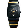 Часы Rado Sintra R13726709, произведение искусства и технологическое чудо, станут прекрасным дополнением к коллекции. Эти швейцарские часы оснащены кварцевым механизмом. Корпус  изготовлен из высокотехнологичной керамикиВысокотехнологичная керамикаИнновационный запатентованный Rado материал с гладкой или матовой поверхностью. Керамика за счёт кристаллической структуры обладает повышенной устойчивостью от возникновения царапин. Материал способен принимать температуру тела человека, обеспечивая невероятный комфорт при ношении.. Браслет изготовлен из керамики со вставками из 18-каратного золота18-каратное золотоОбозначение по каратной системе пробирования, оно показывает, сколько драгоценного металла содержится в изделии. 18 карат - в составе 75% чистого золота, соответствует 750 пробе.