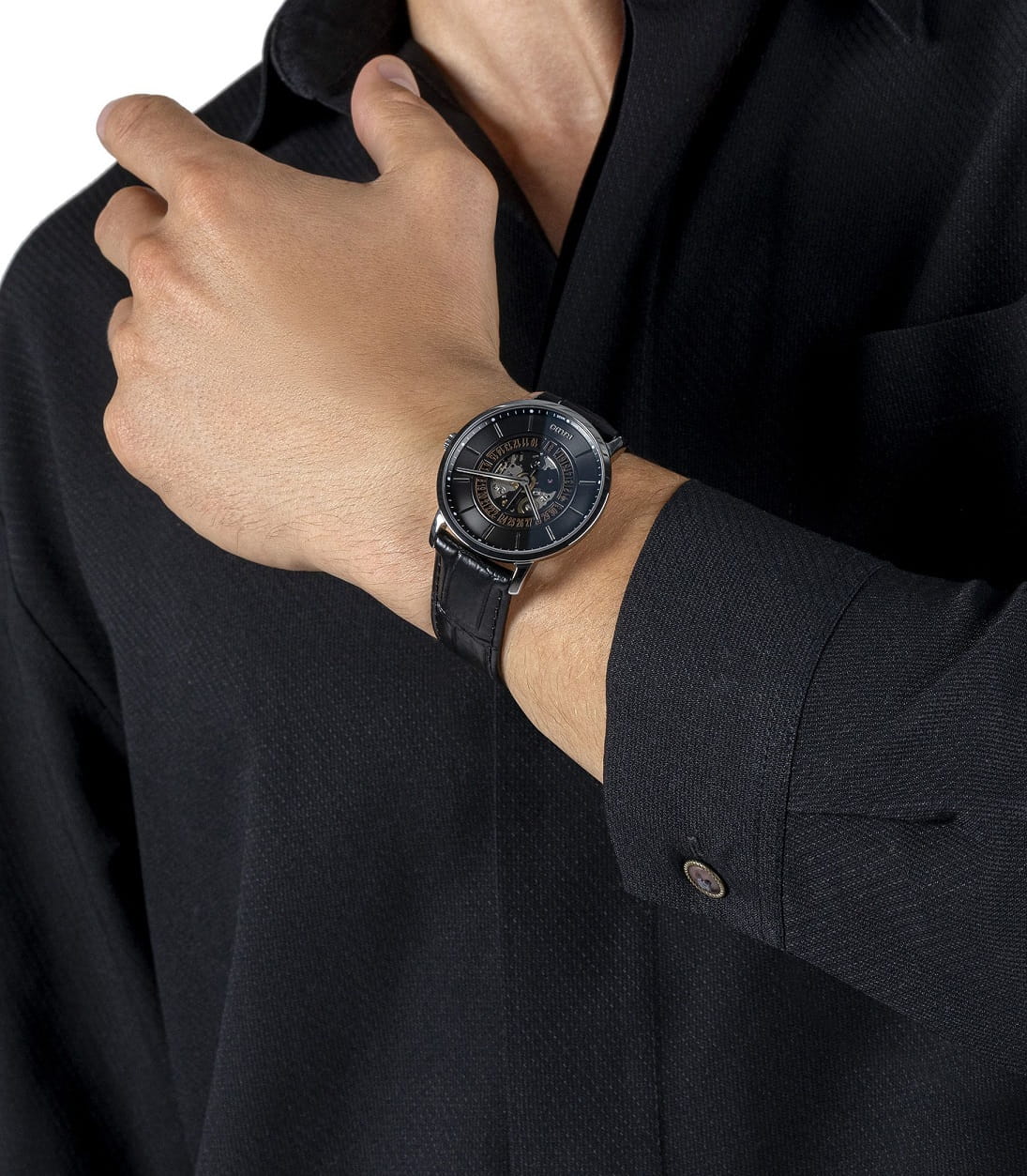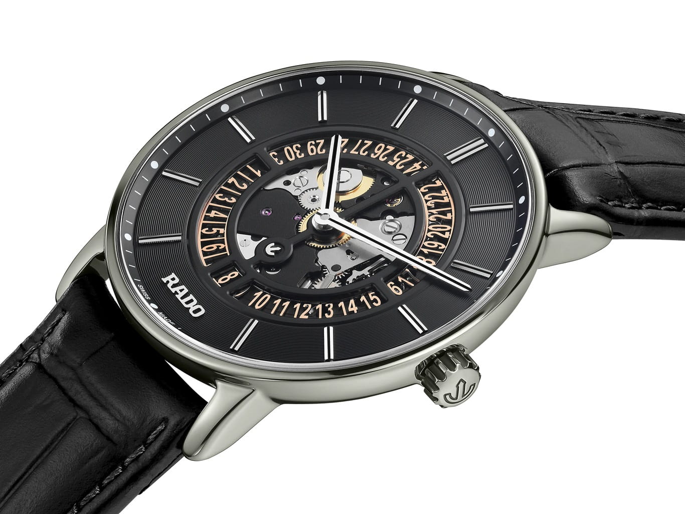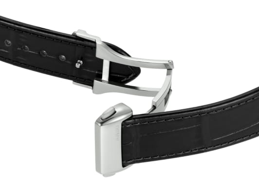 Несмотря на общее классическое исполнение, наручные часы выглядят ярко и эффектно, лучше всего гармонируя с брендовыми деловыми костюмами. Скелетонизированный циферблат выполнен с метками в виде штрихов, украшенных черным шпоном. Оригинальное окошко даты в положении 6 часа. Корпус выполнен из керамики и металла. Ремешок из натуральной кожи. Сапфировое стеклоСапфировое стеклоПрочный и надёжный материал из кристалла сапфира синтетического происхождения, характеризующийся особой твёрдостью и устойчивостью к царапинам и повреждениям. с покрытием «антиблик». Кожаный ремешок с раскладной застёжкойРаскладная застёжкаТакой тип застёжки используется только на браслетах из металла. Она никогда не раскрывается полностью, происходит разделение на 2 и более частей. Раскладывающая застёжка снизит вероятность потери часов к минимуму.. Прозрачная задняя крышка открывает обзор на слаженную работу механизма. Диаметр корпуса: 40,7 мм.