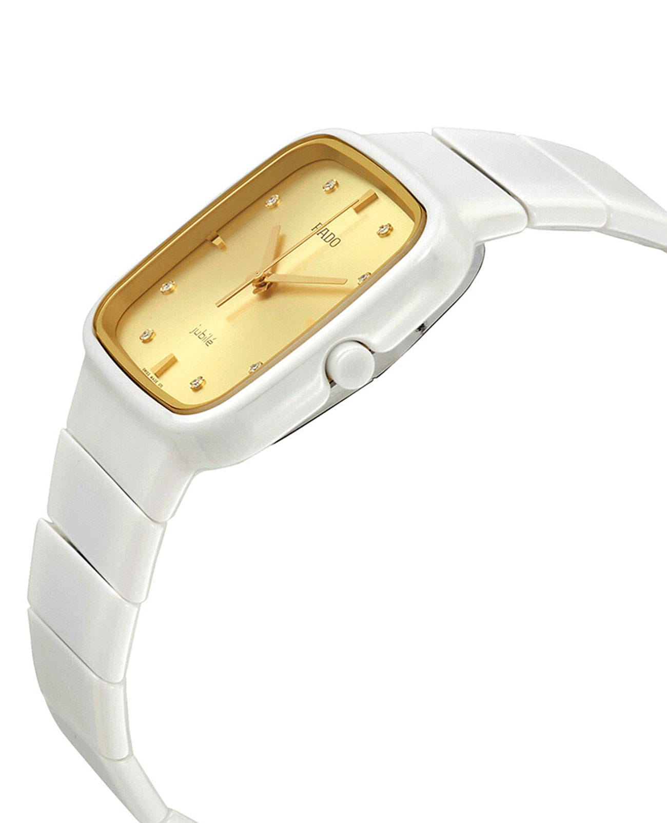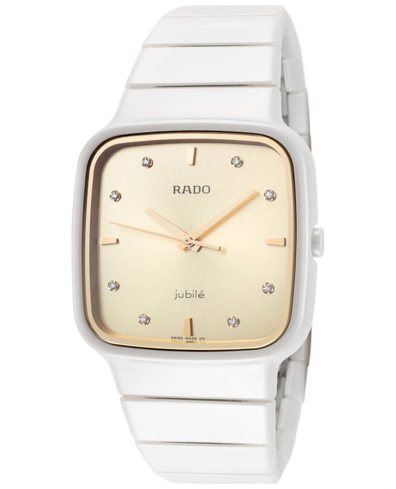 Швейцарские часы Rado R5.5 R28888152. Сапфировое стеклоСапфировое стеклоПрочный и надёжный материал из кристалла сапфира синтетического происхождения, характеризующийся особой твёрдостью и устойчивостью к царапинам и повреждениям. устойчивое к мелким механическим повреждениям. Корпус часов изготовлен из высокотехнологичной плазменной керамикиВысокотехнологичная плазменная керамикаИнновационный материал, технология запатентована. Выплавление керамики осуществляется в печи при 20 000 °C, белоснежный материал под воздействием ультравысокой температуры приобретает уникальный блеск, присущий металлам.. Стрелки и метки с люминесцентным покрытиемЛюминесцентное покрытиеПозволяет считывать показания времени в темноте. Производители наносят на стрелки, часовые индексы, безель или поверхность циферблата светонакопительный состав, дающий холодное свечение.. Класс водозащиты: 30 метров, позволит защитить корпус от случайных брызг или капель дождя. Браслет из высокотехнологичной плазменной керамикиВысокотехнологичная плазменная керамикаИнновационный материал, технология запатентована. Выплавление керамики осуществляется в печи при 20 000 °C, белоснежный материал под воздействием ультравысокой температуры приобретает уникальный блеск, присущий металлам. на раскладной застёжкеРаскладная застёжкаТакой тип застёжки используется только на браслетах из металла. Она никогда не раскрывается полностью, происходит разделение на 2 и более частей. Раскладывающая застёжка снизит вероятность потери часов к минимуму.. Циферблат декорирован 8 бриллиантами.