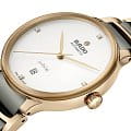 Аксессуар с белым циферблатом являет собой сочетание классической красоты и современного дизайна, отражающего минимализм. Его безупречная работа обеспечивается за счёт швейцарского автоматического механизма с 80-часовым запасом хода. Прозрачная задняя крышка позволяет прикоснуться к часовому искусству и понаблюдать за движением деталей. Сапфировое стеклоСапфировое стеклоПрочный и надёжный материал из кристалла сапфира синтетического происхождения, характеризующийся особой твёрдостью и устойчивостью к царапинам и повреждениям.. Браслет из высокотехнологичной керамики и нержавеющей стали с PVDPVDУльтратонкое покрытие наносится в технике вакуумного напыления, сочетает в себе нитрид титана особой прочности со слоем золота или оксида хрома. Несёт в себе декоративную или защитную функцию. покрытием. Водонепроницаемость 50 метров. . Окошко даты.