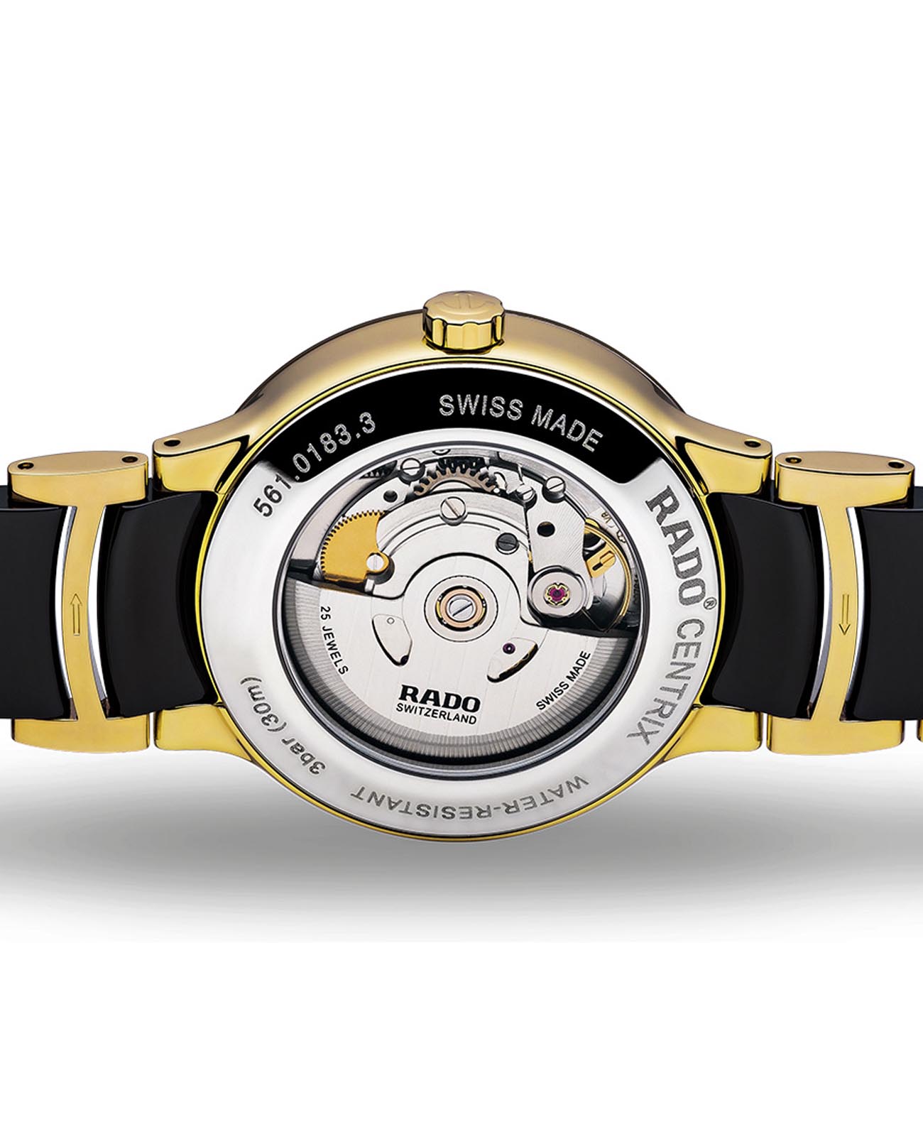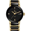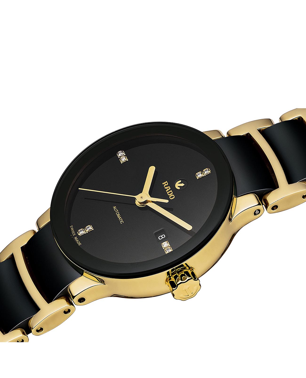 Швейцарские женские механические часы с автоподзаводом Rado Centrix R30034712. Сапфировое стеклоСапфировое стеклоПрочный и надёжный материал из кристалла сапфира синтетического происхождения, характеризующийся особой твёрдостью и устойчивостью к царапинам и повреждениям. устойчивое к мелким механическим повреждениям. Корпус часов изготовлен из нержавеющей стали с PVD-покрытиемPVDУльтратонкое покрытие наносится в технике вакуумного напыления, сочетает в себе нитрид титана особой прочности со слоем золота или оксида хрома. Несёт в себе декоративную или защитную функцию.. БезельБезельВнешний ободок, закрепляющий стекло. В спортивных часах так называется поворотное кольцо с делениями на циферблате, выполняет роль таймера – замеряет отрезки времени на шкале. Неподвижный безель – элемент декора. Однонаправленно вращающийся безель на дайверских часах позволяет фиксировать моменты погружения и выныривания на поверхность. из керамики. Окошко даты находится в положении 3 часа. Циферблат украшен бриллиантами. Класс водозащиты: 30 метров, позволит защитить корпус от случайных брызг или капель дождя. Браслет нержавеющей стали с PVD-покрытиемPVDУльтратонкое покрытие наносится в технике вакуумного напыления, сочетает в себе нитрид титана особой прочности со слоем золота или оксида хрома. Несёт в себе декоративную или защитную функцию. и высокотехнологичной плазменной керамикиВысокотехнологичная плазменная керамикаИнновационный материал, технология запатентована. Выплавление керамики осуществляется в печи при 20 000 °C, белоснежный материал под воздействием ультравысокой температуры приобретает уникальный блеск, присущий металлам. на раскладной застёжкеРаскладная застёжкаТакой тип застёжки используется только на браслетах из металла. Она никогда не раскрывается полностью, происходит разделение на 2 и более частей. Раскладывающая застёжка снизит вероятность потери часов к минимуму..