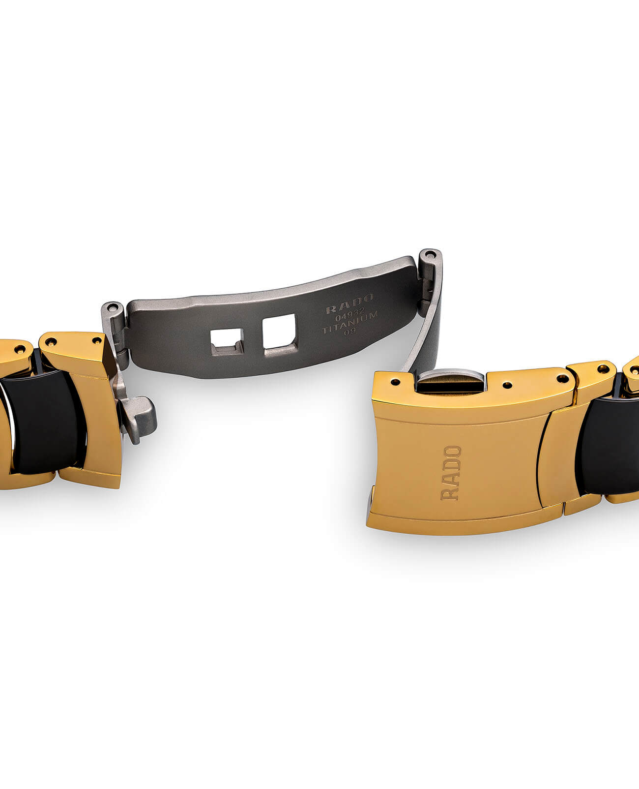 Аксессуар отличается элегантной лаконичностью, такая модель предоставляет возможность почувствовать себя настоящей леди. Циферблат, выполненный в стиле минимализм, привлекает блеском драгоценных камней - в качестве декорирующих элементов использовано 8 бриллиантов в 0,030 карат. Часы обеспечивают отменную точность хода благодаря швейцарскому автоматическому механизму ETA C07.611, его запас хода рассчитан на 80 часов. Оригинально смотрится браслет из нержавеющей стали 316L с золотистым PVD-покрытиемPVDУльтратонкое покрытие наносится в технике вакуумного напыления, сочетает в себе нитрид титана особой прочности со слоем золота или оксида хрома. Несёт в себе декоративную или защитную функцию. и высокотехнологичной керамикиВысокотехнологичная керамикаИнновационный запатентованный Rado материал с гладкой или матовой поверхностью. Керамика за счёт кристаллической структуры обладает повышенной устойчивостью от возникновения царапин. Материал способен принимать температуру тела человека, обеспечивая невероятный комфорт при ношении.. Сапфировое стекло препятствует образованию царапин. Водонепроницаемость 30 метров. . Апертура даты. Диаметр корпуса: 38 мм.