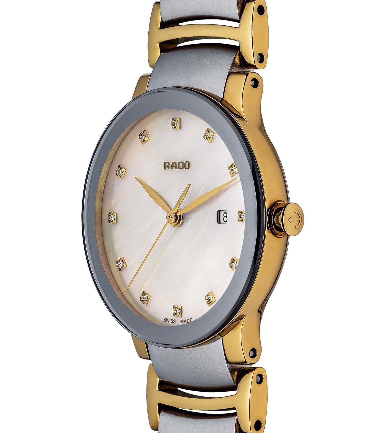 Швейцарские женские часы с надёжным кварцевым механизмом Rado Centrix Diamonds R30932923. Корпус часов изготовлен из нержавеющей стали. Браслет из стали с частичным PVD-покрытиемPVDУльтратонкое покрытие наносится в технике вакуумного напыления, сочетает в себе нитрид титана особой прочности со слоем золота или оксида хрома. Несёт в себе декоративную или защитную функцию. на раскладной застёжкеРаскладная застёжкаТакой тип застёжки используется только на браслетах из металла. Она никогда не раскрывается полностью, происходит разделение на 2 и более частей. Раскладывающая застёжка снизит вероятность потери часов к минимуму.. Сапфировое стеклоСапфировое стеклоПрочный и надёжный материал из кристалла сапфира синтетического происхождения, характеризующийся особой твёрдостью и устойчивостью к царапинам и повреждениям. устойчивое к мелким механическим повреждениям. Класс водозащиты: 30 метров, позволит защитить корпус от случайных брызг или капель дождя. Окошко даты находится в положении 3 часа. Стрелки и метки с люминесцентным покрытиемЛюминесцентное покрытиеПозволяет считывать показания времени в темноте. Производители наносят на стрелки, часовые индексы, безель или поверхность циферблата светонакопительный состав, дающий холодное свечение..