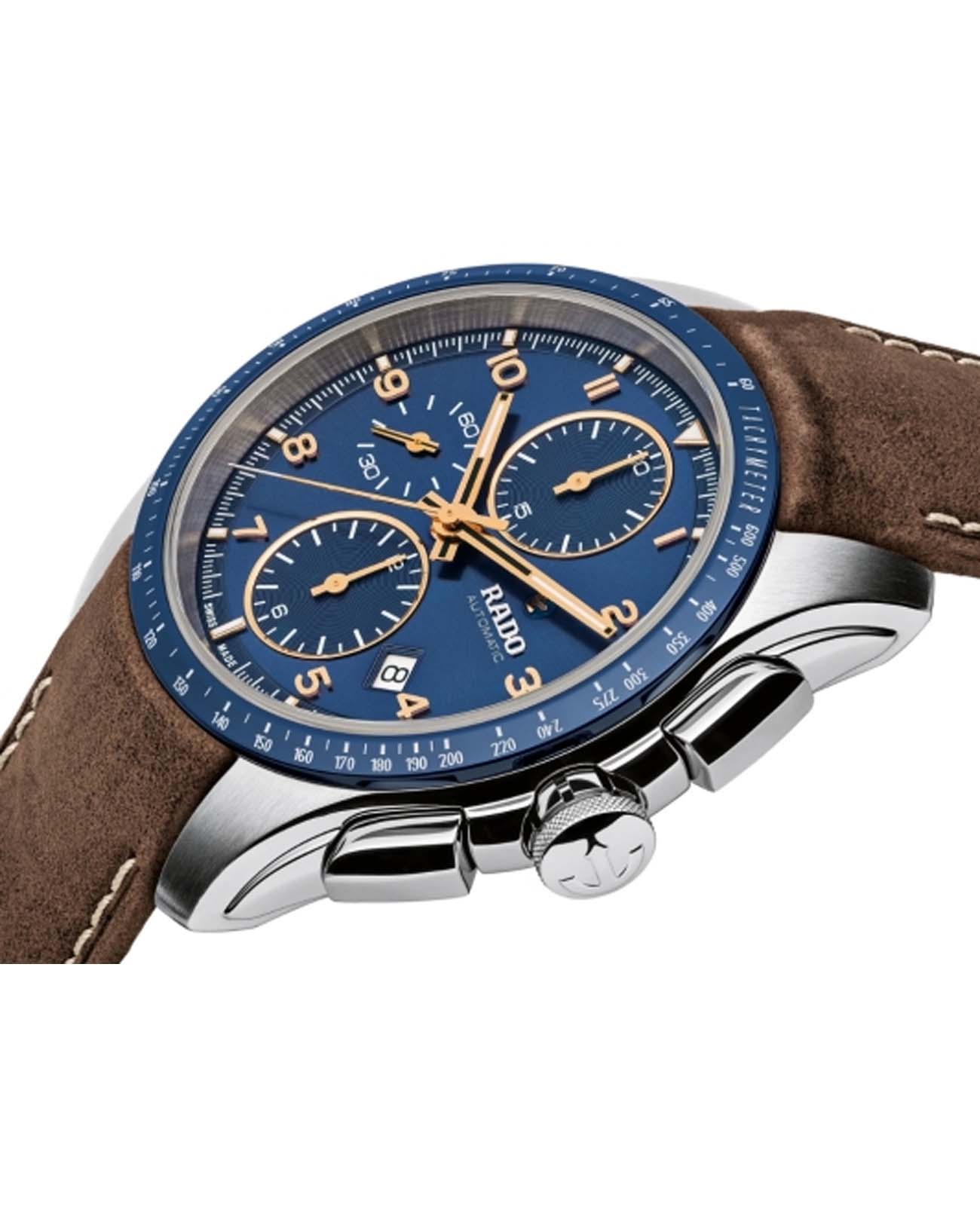 Мужские механические швейцарские часы-хронографХронографФункция позволяет измерять отрезки времени с особой точностью: часы, минуты, секунды. Верным признаком хронографа является наличие на циферблате 3 дополнительных окошек-счётчиков. с автоподзаводом Rado Hyperchrome Automatic Chronograph R32042205. Сапфировое стеклоСапфировое стеклоПрочный и надёжный материал из кристалла сапфира синтетического происхождения, характеризующийся особой твёрдостью и устойчивостью к царапинам и повреждениям. устойчивое к мелким механическим повреждениям. Корпус часов изготовлен из нержавеющей стали и титана. БезельБезельВнешний ободок, закрепляющий стекло. В спортивных часах так называется поворотное кольцо с делениями на циферблате, выполняет роль таймера – замеряет отрезки времени на шкале. Неподвижный безель – элемент декора. Однонаправленно вращающийся безель на дайверских часах позволяет фиксировать моменты погружения и выныривания на поверхность. со шкалой тахиметраТахиметрРазмеченная шкала, располагается на ободке или безеле часов. Тахиметр позволяет рассчитать скорость на определённом участке пути, расстояние измеряется в километрах или милях. из высокотехнологичной керамикиВысокотехнологичная керамикаИнновационный запатентованный Rado материал с гладкой или матовой поверхностью. Керамика за счёт кристаллической структуры обладает повышенной устойчивостью от возникновения царапин. Материал способен принимать температуру тела человека, обеспечивая невероятный комфорт при ношении.. Окошко даты находится в положении между 4 и 5 часами. Стрелки с люминесцентным покрытиемЛюминесцентное покрытиеПозволяет считывать показания времени в темноте. Производители наносят на стрелки, часовые индексы, безель или поверхность циферблата светонакопительный состав, дающий холодное свечение.. Класс водозащиты: 100 метров, позволит плавать, нырять и заниматься другими водными видами спорта. Кожаный ремешок на раскладной застёжкеРаскладная застёжкаТакой тип застёжки используется только на браслетах из металла. Она никогда не раскрывается полностью, происходит разделение на 2 и более частей. Раскладывающая застёжка снизит вероятность потери часов к минимуму..