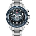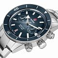 Хронограф Капитана Кука имеет характерное, устойчивое к царапинам сапфировое стеклоСапфировое стеклоПрочный и надёжный материал из кристалла сапфира синтетического происхождения, характеризующийся особой твёрдостью и устойчивостью к царапинам и повреждениям. с антибликовым покрытием на обеих сторонах. Тонкий стильный корпус диаметром 43 мм из нержавеющей стали имеет полированную синюю высокотехнологичную керамическую вставку на безелеБезельВнешний ободок, закрепляющий стекло. В спортивных часах так называется поворотное кольцо с делениями на циферблате, выполняет роль таймера – замеряет отрезки времени на шкале. Неподвижный безель – элемент декора. Однонаправленно вращающийся безель на дайверских часах позволяет фиксировать моменты погружения и выныривания на поверхность., дополняющую серебристо-синий градиентный циферблат. На цифры, маркеры и стрелочки нанесено люминесцентное покрытиеЛюминесцентное покрытиеПозволяет считывать показания времени в темноте. Производители наносят на стрелки, часовые индексы, безель или поверхность циферблата светонакопительный состав, дающий холодное свечение. Super-LumiNova®. Внутри новый, более тонкий автоматический механизм R801 с 37 камнями, пятью стрелками и 59 часами запаса хода благодаря антимагнитной пружине Nivachron™Nivachron™Специально разработанный инновационный сплав Nivachron™ повышает устойчивость часов к воздействию магнитных полей., превосходит стандартные требования к испытаниям с 3 до 5 положений для более высокой точности. Модель поставляется с полированным и матовым браслетом из нержавеющей стали, а также синим кожаным ремешком и дополнительным тканевым ремешком темно-синего цвета.