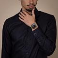 Мужские кварцевые часы Rado HyperChrome — это современное воплощение точности и мастерства материалов. Корпус диаметром 41,5 мм и толщиной 11,7 мм выполнен из полированной и матовой нержавеющей стали. БезельБезельВнешний ободок, закрепляющий стекло. В спортивных часах так называется поворотное кольцо с делениями на циферблате, выполняет роль таймера – замеряет отрезки времени на шкале. Неподвижный безель – элемент декора. Однонаправленно вращающийся безель на дайверских часах позволяет фиксировать моменты погружения и выныривания на поверхность. изготовлен из высокотехнологичной керамикиВысокотехнологичная керамикаИнновационный запатентованный Rado материал с гладкой или матовой поверхностью. Керамика за счёт кристаллической структуры обладает повышенной устойчивостью от возникновения царапин. Материал способен принимать температуру тела человека, обеспечивая невероятный комфорт при ношении. чёрного цвета, придающей часам прочность и изысканность. Циферблат чёрного цвета с лакированным покрытием оформлен индексами и стрелками с люминесцентным покрытиемЛюминесцентное покрытиеПозволяет считывать показания времени в темноте. Производители наносят на стрелки, часовые индексы, безель или поверхность циферблата светонакопительный состав, дающий холодное свечение. Super-Luminova®. Особенность подсветки — зелёное свечение метки 12 часов и минутной стрелки, и синее — остальных индексов и часовой стрелки, что обеспечивает интуитивное считывание времени в темноте. Циферблат защищён выпуклым сапфировым стекломСапфировое стеклоПрочный и надёжный материал из кристалла сапфира синтетического происхождения, характеризующийся особой твёрдостью и устойчивостью к царапинам и повреждениям. с антибликовым покрытиемАнтибликовое покрытиеСлой оксида металла в 0,13-0,3 микрон, благодаря которому стекло часов не бликует и не отражает свет. Антибликовое покрытие уменьшает отражение света в 10 раз, обеспечивая отличную читаемость показателей циферблата. на внутренней стороне. Механизм — кварцевый. Окошко даты расположено в положении 3 часов. Часы оснащены трёхрядным стальным браслетом с центральными звеньями, покрытыми PVD-покрытиемPVDУльтратонкое покрытие наносится в технике вакуумного напыления, сочетает в себе нитрид титана особой прочности со слоем золота или оксида хрома. Несёт в себе декоративную или защитную функцию. жёлтого золота, и трёхсекционной застёжкой с системой быстрой регулировки. Водонепроницаемость 150 м позволяет использовать часы для плавания и повседневного ношения. Идеальный выбор для тех, кто ценит инновации, точность и смелый дизайн.