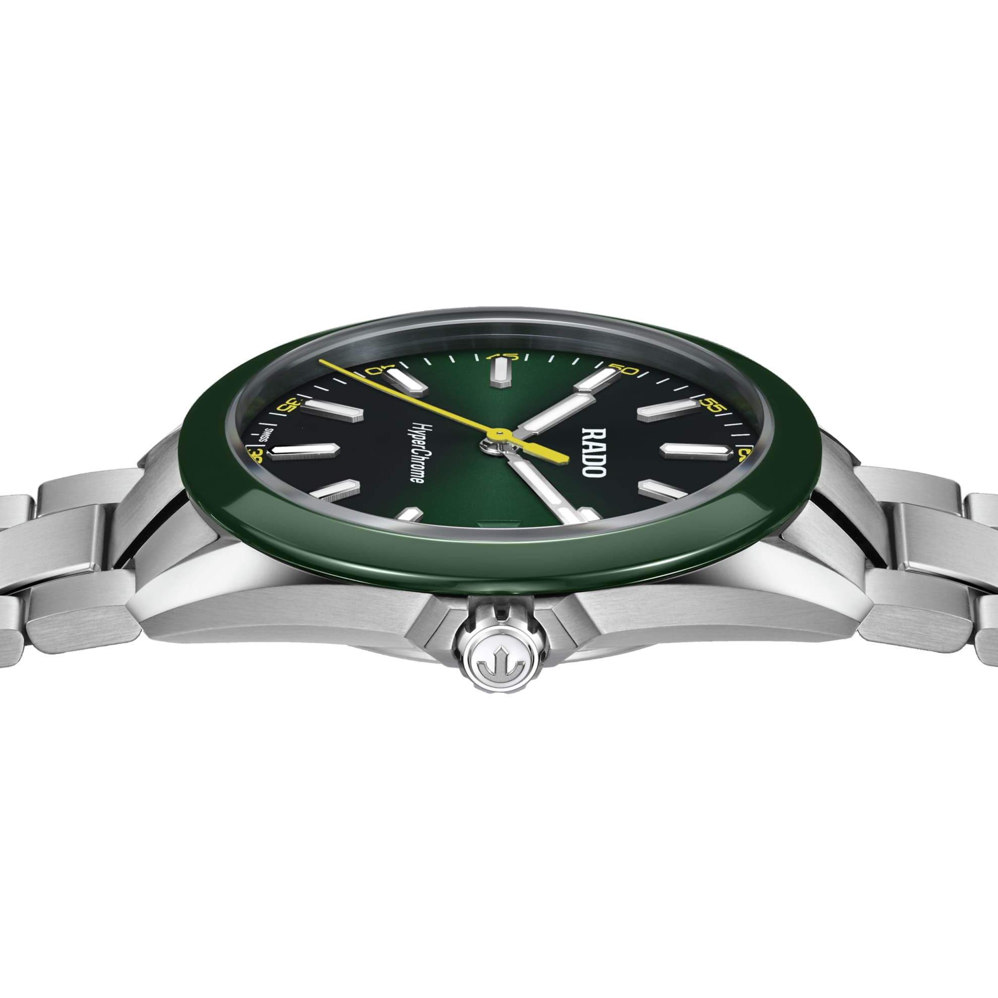 Мужские кварцевые часы Rado HyperChrome — это современное воплощение точности и мастерства материалов. Корпус диаметром 41,5 мм и толщиной 11,7 мм выполнен из полированной и матовой нержавеющей стали. БезельБезельВнешний ободок, закрепляющий стекло. В спортивных часах так называется поворотное кольцо с делениями на циферблате, выполняет роль таймера – замеряет отрезки времени на шкале. Неподвижный безель – элемент декора. Однонаправленно вращающийся безель на дайверских часах позволяет фиксировать моменты погружения и выныривания на поверхность. изготовлен из высокотехнологичной керамикиВысокотехнологичная керамикаИнновационный запатентованный Rado материал с гладкой или матовой поверхностью. Керамика за счёт кристаллической структуры обладает повышенной устойчивостью от возникновения царапин. Материал способен принимать температуру тела человека, обеспечивая невероятный комфорт при ношении. зелёного цвета, придающей часам прочность и изысканность. Циферблат зелёного цвета с лакированным покрытием оформлен индексами и стрелками с люминесцентным покрытиемЛюминесцентное покрытиеПозволяет считывать показания времени в темноте. Производители наносят на стрелки, часовые индексы, безель или поверхность циферблата светонакопительный состав, дающий холодное свечение. Super-Luminova®. Особенность подсветки — зелёное свечение метки 12 часов и минутной стрелки, и синее — остальных индексов и часовой стрелки, что обеспечивает интуитивное считывание времени в темноте. Циферблат защищён выпуклым сапфировым стекломСапфировое стеклоПрочный и надёжный материал из кристалла сапфира синтетического происхождения, характеризующийся особой твёрдостью и устойчивостью к царапинам и повреждениям. с антибликовым покрытиемАнтибликовое покрытиеСлой оксида металла в 0,13-0,3 микрон, благодаря которому стекло часов не бликует и не отражает свет. Антибликовое покрытие уменьшает отражение света в 10 раз, обеспечивая отличную читаемость показателей циферблата. на внутренней стороне. Механизм — кварцевый. Окошко даты расположено в положении 3 часов. Часы оснащены трёхрядным стальным браслетом с центральными звеньями и трёхсекционной застёжкой с системой быстрой регулировки. Водонепроницаемость 150 м позволяет использовать часы для плавания и повседневного ношения. Идеальный выбор для тех, кто ценит инновации, точность и смелый дизайн.
