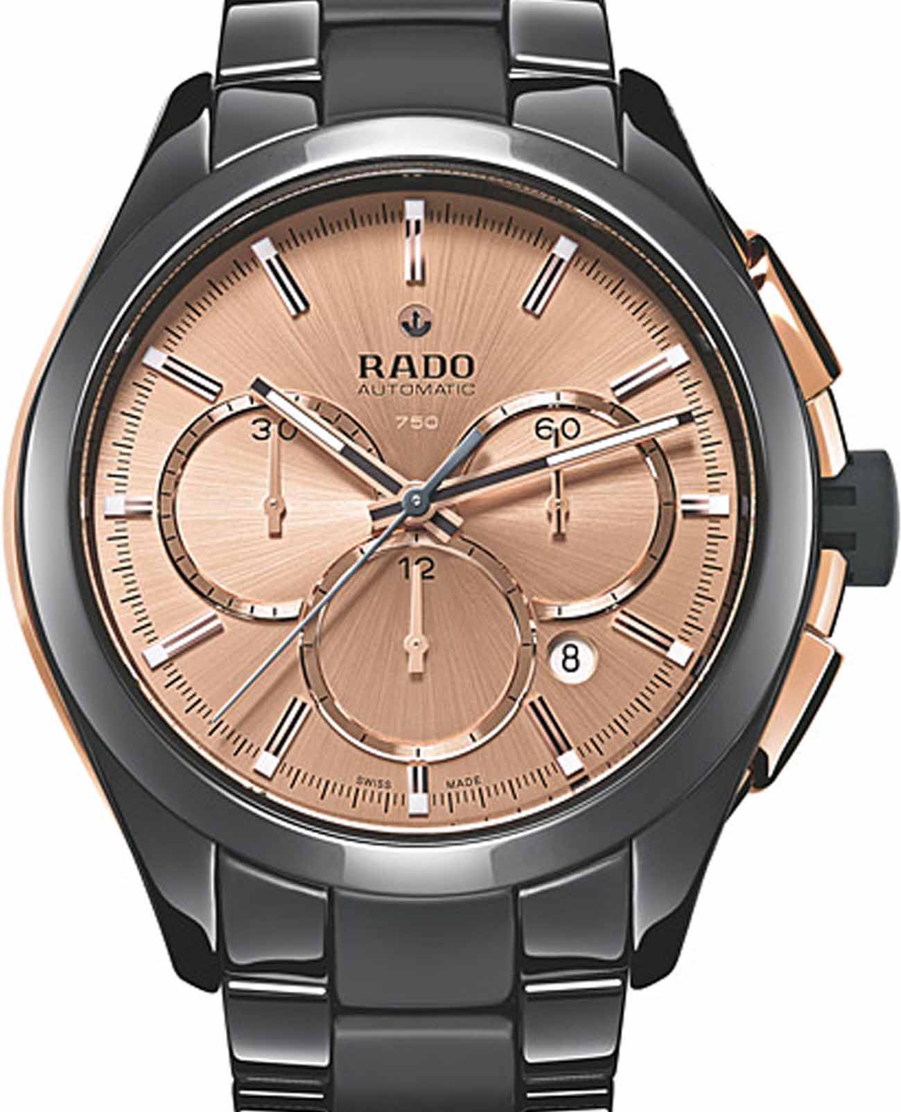 Мужские механические швейцарские часы- хронографХронографФункция позволяет измерять отрезки времени с особой точностью: часы, минуты, секунды. Верным признаком хронографа является наличие на циферблате 3 дополнительных окошек-счётчиков. с автоподзаводом Rado HyperChrome Automatic Chronograph R32754692. Ограниченный выпуск (333 экземпляра). Сапфировое стеклоСапфировое стеклоПрочный и надёжный материал из кристалла сапфира синтетического происхождения, характеризующийся особой твёрдостью и устойчивостью к царапинам и повреждениям. устойчивое к мелким механическим повреждениям. Корпус часов изготовлен из высокотехнологичной керамикиВысокотехнологичная керамикаИнновационный запатентованный Rado материал с гладкой или матовой поверхностью. Керамика за счёт кристаллической структуры обладает повышенной устойчивостью от возникновения царапин. Материал способен принимать температуру тела человека, обеспечивая невероятный комфорт при ношении. и 18-каратного золота18-каратное золотоОбозначение по каратной системе пробирования, оно показывает, сколько драгоценного металла содержится в изделии. 18 карат - в составе 75% чистого золота, соответствует 750 пробе.