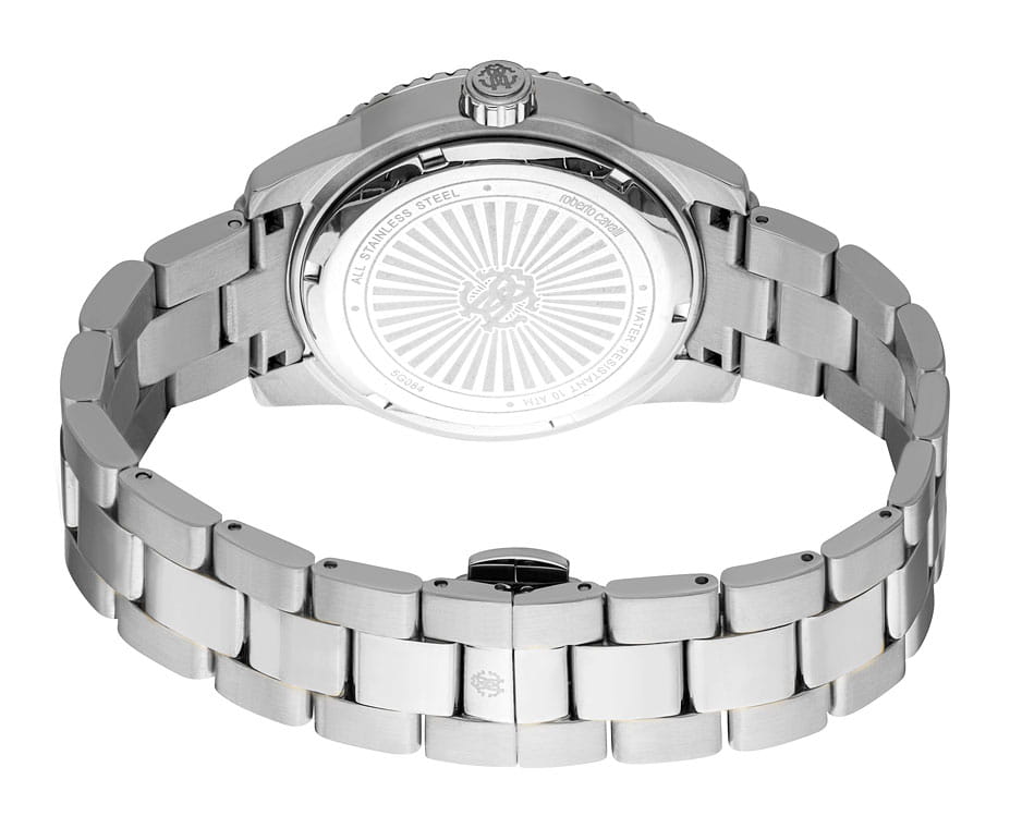 ROBERTO CAVALLI Acquatico RC5G084M0025 — стильные итальянские часы сочетающие в себе элегантность и современный функционал. Круглый корпус диаметром 42 мм выполнен из нержавеющей стали, толщина корпуса составляет 11 мм, что придает модели выразительный внешний вид и надежную защиту от внешних воздействий. Часы оснащены кварцевым механизмом, также обладают функцией отображения даты, что делает их удобными для ежедневного использования. Минеральное стеклоМинеральное стеклоМинеральное стекло представляет собой искусственно выращенный минерал кварца. Такое стекло отличается особой устойчивостью к повреждениям и царапинам. Уступает по некоторым качествам сапфировому стеклу. защищает часы от царапин. Водозащита 100 метров, позволит плавать, нырять и заниматься другими водными видами спорта. Стальной браслет на застёжке-бабочке с кнопкамиЗастёжка "бабочка"Такой вид застёжки дополняется предохранителями, помогающими избежать случайного раскрытия браслета. Обладают изящным исполнением. обеспечивает комфортное ношение. Поворотный безельБезельВнешний ободок, закрепляющий стекло. В спортивных часах так называется поворотное кольцо с делениями на циферблате, выполняет роль таймера – замеряет отрезки времени на шкале. Неподвижный безель – элемент декора. Однонаправленно вращающийся безель на дайверских часах позволяет фиксировать моменты погружения и выныривания на поверхность. с PVD-покрытиемPVDУльтратонкое покрытие наносится в технике вакуумного напыления, сочетает в себе нитрид титана особой прочности со слоем золота или оксида хрома. Несёт в себе декоративную или защитную функцию.. Стрелки и метки с люминесцентным покрытиемЛюминесцентное покрытиеПозволяет считывать показания времени в темноте. Производители наносят на стрелки, часовые индексы, безель или поверхность циферблата светонакопительный состав, дающий холодное свечение. обеспечивают отличную читаемость в любое время суток.