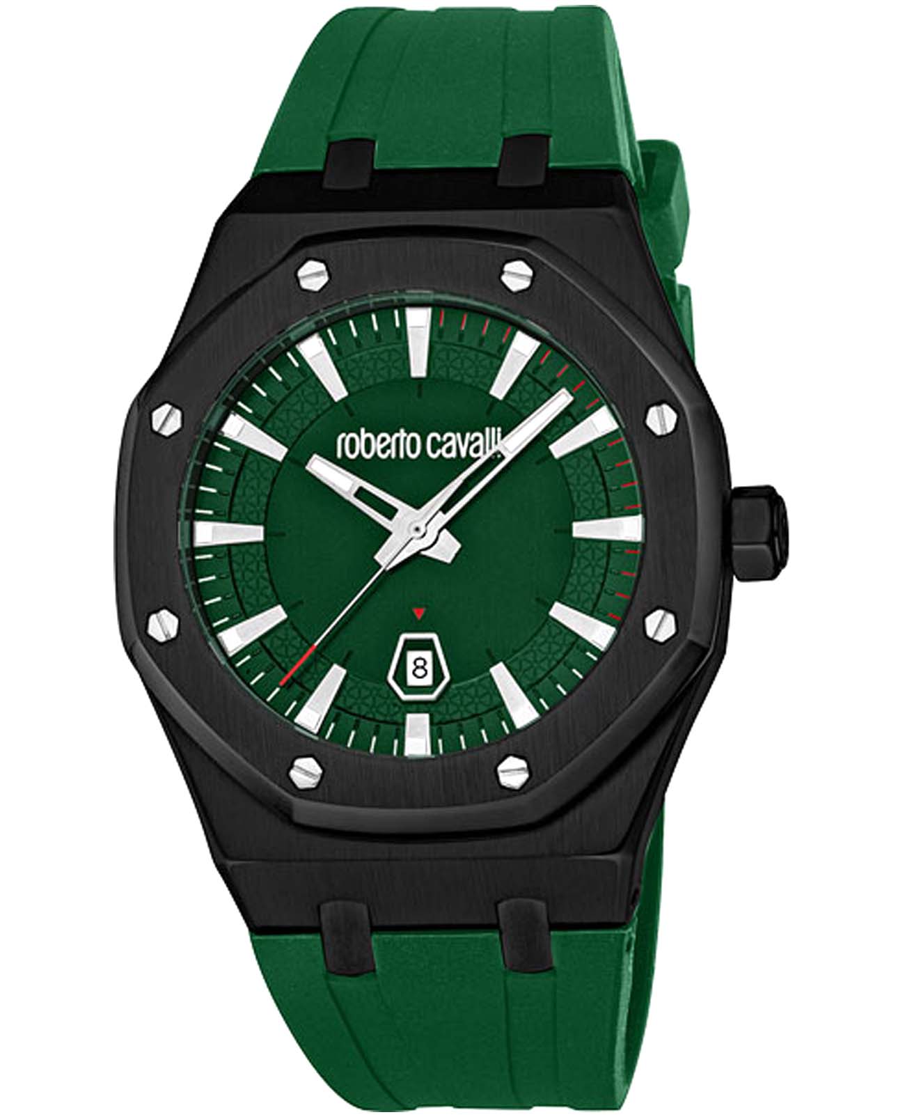 ROBERTO CAVALLI Uomo Ottagono RC5G102P0035 — стильные итальянские часы сочетающие в себе элегантность и современный функционал. Корпус диаметром 42 мм выполнен из нержавеющей стали с PVD-покрытиемPVDУльтратонкое покрытие наносится в технике вакуумного напыления, сочетает в себе нитрид титана особой прочности со слоем золота или оксида хрома. Несёт в себе декоративную или защитную функцию., толщина корпуса составляет 12 мм, что придает модели выразительный внешний вид и надежную защиту от внешних воздействий. Циферблат, искусно оформленный фирменными элементами Roberto Cavalli, притягивает взгляд и подчеркивает ваш безупречный вкус. Часы оснащены кварцевым механизмом, также обладают функцией отображения даты, что делает их удобными для ежедневного использования. Минеральное стеклоМинеральное стеклоМинеральное стекло представляет собой искусственно выращенный минерал кварца. Такое стекло отличается особой устойчивостью к повреждениям и царапинам. Уступает по некоторым качествам сапфировому стеклу. защищает часы от царапин. Водозащита 30 метров позволит защитить корпус от случайных брызг или капель дождя. Силиконовый ремешок на стандартной застёжке обеспечивает комфортное ношение. Стрелки и метки с люминесцентным покрытиемЛюминесцентное покрытиеПозволяет считывать показания времени в темноте. Производители наносят на стрелки, часовые индексы, безель или поверхность циферблата светонакопительный состав, дающий холодное свечение. обеспечивают отличную читаемость в любое время суток.