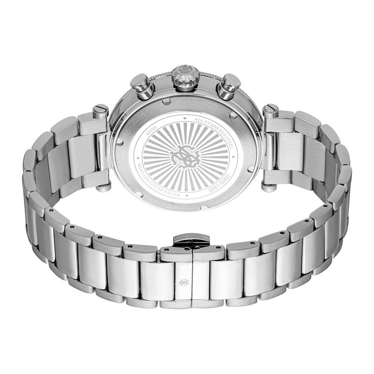 Roberto Cavalli Ritmo RC5G128M0045 — мужская кварцевая модель с ярко выраженным спортивным стилем и практичным функционалом, сочетающая строгий дизайн и надёжность. Корпус диаметром 43 мм и толщиной 12 мм выполнен из нержавеющей стали, защищён прочным минеральным стекломМинеральное стеклоМинеральное стекло представляет собой искусственно выращенный минерал кварца. Такое стекло отличается особой устойчивостью к повреждениям и царапинам. Уступает по некоторым качествам сапфировому стеклу., устойчивым к повседневным повреждениям и сохраняющим хорошую читаемость циферблата. БезельБезельВнешний ободок, закрепляющий стекло. В спортивных часах так называется поворотное кольцо с делениями на циферблате, выполняет роль таймера – замеряет отрезки времени на шкале. Неподвижный безель – элемент декора. Однонаправленно вращающийся безель на дайверских часах позволяет фиксировать моменты погружения и выныривания на поверхность.. Водозащита 100 м делает часы надёжным спутником во время плавания и активного отдыха. Функциональность поддерживается индикаторами хронографаХронографФункция позволяет измерять отрезки времени с особой точностью: часы, минуты, секунды. Верным признаком хронографа является наличие на циферблате 3 дополнительных окошек-счётчиков. и даты, которые органично вписаны в оформление циферблата. Стальной браслет на застёжке-бабочке с кнопкамиЗастёжка "бабочка"Такой вид застёжки дополняется предохранителями, помогающими избежать случайного раскрытия браслета. Обладают изящным исполнением. обеспечивает комфортную посадку и долговечность, а также гармонично завершает образ модели, которая одинаково хорошо подойдёт как для динамичного повседневного ритма, так и для более строгих ситуаций.