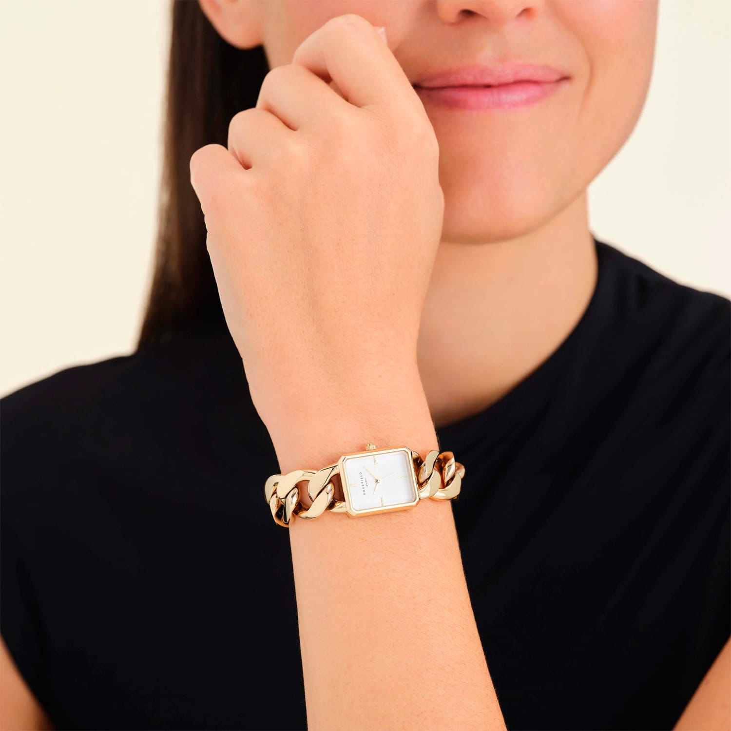 Модель оснащена кварцевым механизмом, обеспечивающим точное измерение времени. Металлический браслет с плоскими звеньями и PVD-покрытиемPVDУльтратонкое покрытие наносится в технике вакуумного напыления, сочетает в себе нитрид титана особой прочности со слоем золота или оксида хрома. Несёт в себе декоративную или защитную функцию. золотистого цвета дополнен застёжкой типа "Т-бар" с гравировкой Rosefield, длина регулируется от 138 до 185 мм для комфортного ношения и надёжной фиксации.