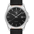 Мужские кварцевые часы Santa Barbara Polo & Racquet Club — это сдержанный и элегантный аксессуар для делового образа. Корпус диаметром 41 мм и высотой 50 мм выполнен из нержавеющей стали 316L. Циферблат чёрного цвета оформлен по технологии Sunray («солнечные лучи»), дополнен накладными метками в виде штрихов и фирменным логотипом. Окошко даты расположено в положении 3 часов. Стрелки мечевидной формы. Циферблат защищён минеральным стеклом. Часы оснащены кожаным ремешком с застёжкой «бабочка» с кнопкамиЗастёжка "бабочка"Такой вид застёжки дополняется предохранителями, помогающими избежать случайного раскрытия браслета. Обладают изящным исполнением. . Водонепроницаемость 50 м позволяет использовать часы в повседневных условиях. Идеальный выбор для тех, кто ценит стиль, надёжность и деловую эстетику.