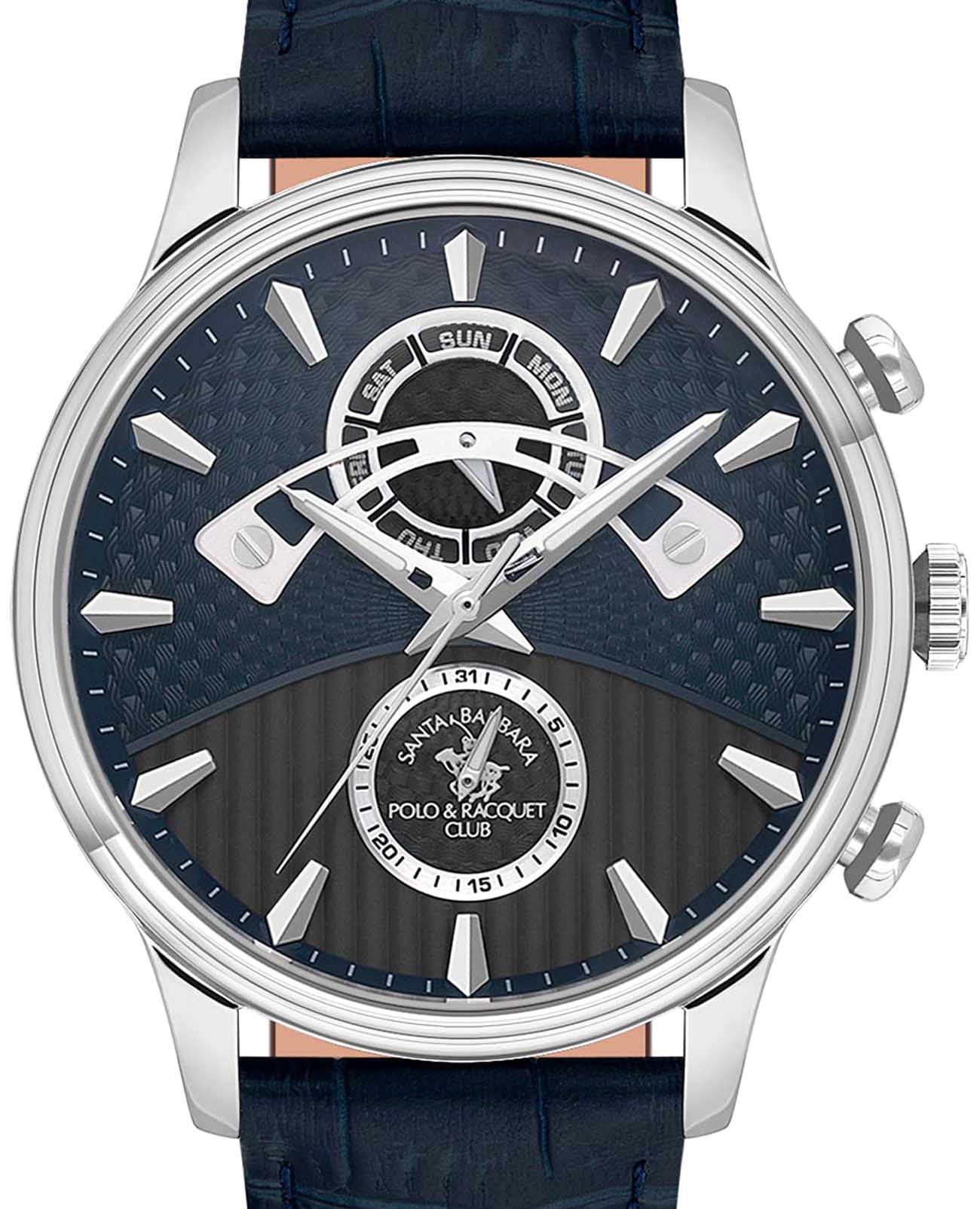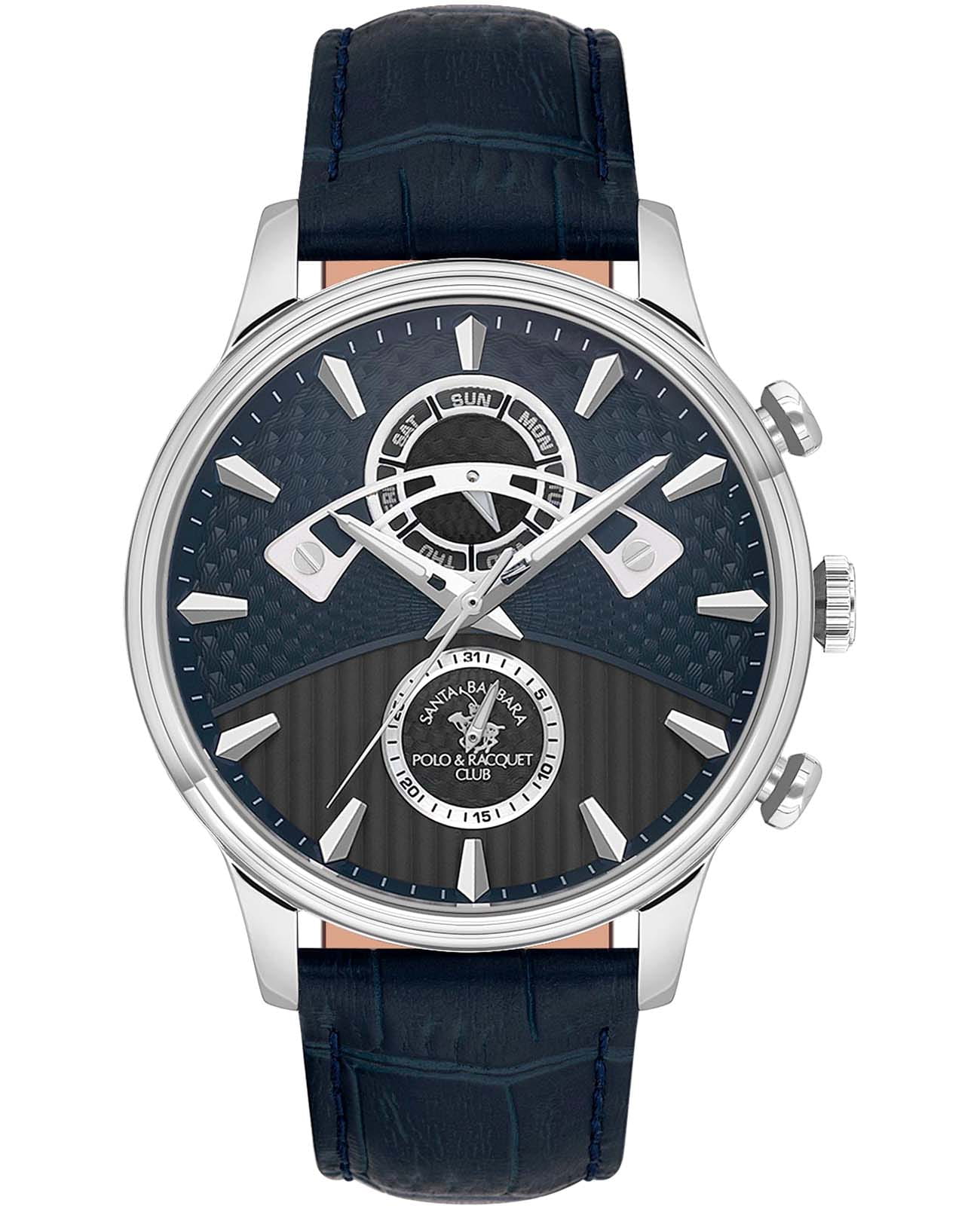 Мужские кварцевые часы Santa Barbara Polo & Racquet Club SB.1.10593-3 — воплощение элегантности и технического совершенства. Корпус из нержавеющей стали серебристого цвета, диаметром 45 мм, что делает их устойчивыми к внешним воздействиям и придает благородный вид. Стрелки с люминесцентным покрытиемЛюминесцентное покрытиеПозволяет считывать показания времени в темноте. Производители наносят на стрелки, часовые индексы, безель или поверхность циферблата светонакопительный состав, дающий холодное свечение., обеспечивающим хорошую читаемость в темноте. Циферблат защищён минеральным стекломМинеральное стеклоМинеральное стекло представляет собой искусственно выращенный минерал кварца. Такое стекло отличается особой устойчивостью к повреждениям и царапинам. Уступает по некоторым качествам сапфировому стеклу. устойчивое к царапинам и механическим повреждениям. Циферблат разделен на две фактурные части и украшен фирменным логотипом. Дата и день недели вынесены на отдельные циферблаты. Кожаный ремешок на застёжке-бабочке с кнопкамиЗастёжка "бабочка"Такой вид застёжки дополняется предохранителями, помогающими избежать случайного раскрытия браслета. Обладают изящным исполнением. обеспечивает комфортное и безопасное ношение. Водонепроницаемость 50 метров позволит защитить корпус от случайных брызг или капель дождя. Идеальный выбор для тех, кто ценит элегантный дизайн и качество.