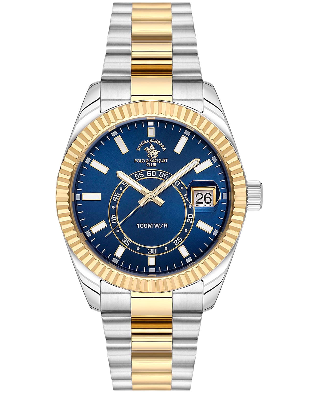 Мужские кварцевые часы Santa Barbara Polo & Racquet Club SB.1.10598-5 — это стильный и практичный аксессуар для повседневного ношения. Корпус диаметром 41 мм выполнен из нержавеющей стали серебристого цвета с полированной отделкой. Циферблат выполнен по технологии Sunray (солнечные лучи) и украшен фирменным логотипом. Накладные метки в виде штрихов. Стрелки и метки с люминесцентным покрытиемЛюминесцентное покрытиеПозволяет считывать показания времени в темноте. Производители наносят на стрелки, часовые индексы, безель или поверхность циферблата светонакопительный состав, дающий холодное свечение., обеспечивающим хорошую читаемость в темноте. Циферблат защищён минеральным стекломМинеральное стеклоМинеральное стекло представляет собой искусственно выращенный минерал кварца. Такое стекло отличается особой устойчивостью к повреждениям и царапинам. Уступает по некоторым качествам сапфировому стеклу.. Кварцевый механизм высокой точности. Часы оснащены стальным браслетом с частичным IP-покрытиемIP-покрытиеМетод ионного напыления. Демонстрирует повышенную устойчивость к истиранию, окислению и химическим веществам. Под воздействием высокого давления и температуры около 1500°C молекулы металла надёжно соединяются с частицами корпуса часов. на раскладной застёжкеРаскладная застёжкаТакой тип застёжки используется только на браслетах из металла. Она никогда не раскрывается полностью, происходит разделение на 2 и более частей. Раскладывающая застёжка снизит вероятность потери часов к минимуму.. Неподвижный рифленый безельБезельВнешний ободок, закрепляющий стекло. В спортивных часах так называется поворотное кольцо с делениями на циферблате, выполняет роль таймера – замеряет отрезки времени на шкале. Неподвижный безель – элемент декора. Однонаправленно вращающийся безель на дайверских часах позволяет фиксировать моменты погружения и выныривания на поверхность. с IP-покрытиемIP-покрытиеМетод ионного напыления. Демонстрирует повышенную устойчивость к истиранию, окислению и химическим веществам. Под воздействием высокого давления и температуры около 1500°C молекулы металла надёжно соединяются с частицами корпуса часов. золотистого цвета. Окошко даты с увеличительным стеклом находится в положении 3 часа. Рифленая заводная головка с защитой. Водонепроницаемость 100 метров позволит плавать, нырять и заниматься другими водными видами спорта. Идеальный выбор для тех, кто ценит функциональность, стиль и качество.
