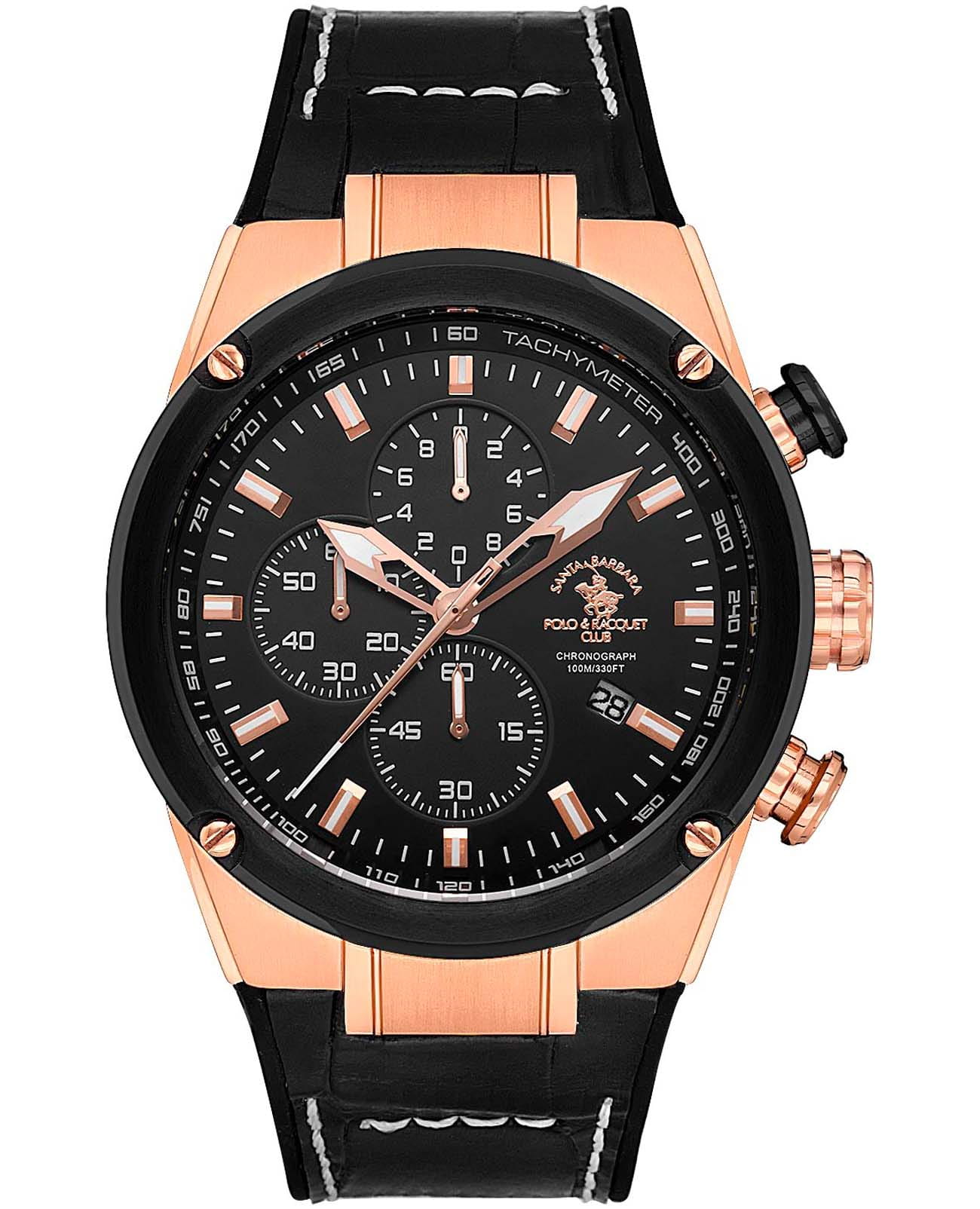 Мужские кварцевые часы-хронографХронографФункция позволяет измерять отрезки времени с особой точностью: часы, минуты, секунды. Верным признаком хронографа является наличие на циферблате 3 дополнительных окошек-счётчиков. с секундомеромСекундомерСекундоме́р — прибор, способный измерять интервалы времени с точностью до долей секунды. Santa Barbara Polo & Racquet Club SB.3.10001-1 — воплощение элегантности и технического совершенства. Корпус из нержавеющей стали с IP-покрытиемIP-покрытиеМетод ионного напыления. Демонстрирует повышенную устойчивость к истиранию, окислению и химическим веществам. Под воздействием высокого давления и температуры около 1500°C молекулы металла надёжно соединяются с частицами корпуса часов. цвета розового золота, диаметром 45 мм, что делает их устойчивыми к внешним воздействиям и придает благородный вид. Стрелки и метки с люминесцентным покрытиемЛюминесцентное покрытиеПозволяет считывать показания времени в темноте. Производители наносят на стрелки, часовые индексы, безель или поверхность циферблата светонакопительный состав, дающий холодное свечение., обеспечивающим хорошую читаемость в темноте. Неподвижный безельБезельВнешний ободок, закрепляющий стекло. В спортивных часах так называется поворотное кольцо с делениями на циферблате, выполняет роль таймера – замеряет отрезки времени на шкале. Неподвижный безель – элемент декора. Однонаправленно вращающийся безель на дайверских часах позволяет фиксировать моменты погружения и выныривания на поверхность. с IP-покрытиемIP-покрытиеМетод ионного напыления. Демонстрирует повышенную устойчивость к истиранию, окислению и химическим веществам. Под воздействием высокого давления и температуры около 1500°C молекулы металла надёжно соединяются с частицами корпуса часов. черного цвета. Циферблат защищён минеральным стекломМинеральное стеклоМинеральное стекло представляет собой искусственно выращенный минерал кварца. Такое стекло отличается особой устойчивостью к повреждениям и царапинам. Уступает по некоторым качествам сапфировому стеклу. устойчивое к царапинам и механическим повреждениям. Окошко даты находится в положении 4 часа, тахиметрТахиметрРазмеченная шкала, располагается на ободке или безеле часов. Тахиметр позволяет рассчитать скорость на определённом участке пути, расстояние измеряется в километрах или милях. по внешнему краю. Кожаный ремешок на стандартной застёжке обеспечивает комфортное и безопасное ношение. Водонепроницаемость 100 метров позволит плавать, нырять и заниматься другими водными видами спорта. Идеальный выбор для тех, кто ценит элегантный дизайн и качество.