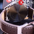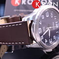 Ремешок выполнен из натуральной кожи коричневого цвета, обеспечивая комфорт при носке. Модель обладает водонепроницаемостью до 100 метров, что делает её подходящей для плавания и сноркелинга.