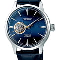 Синий циферблат привлекает лаконичным узором, крупная индикация времени обеспечивает идеальную читаемость данных. На позиции 9 часов размещено круглое окошко, позволяющее прикоснуться к миру часового искусства. Это часы с автоподзаводом, работа японского автоматического механизма Seiko 4R38 просматривается сквозь завинчивающуюся прозрачную заднюю крышку. Запас хода – 40 часов, функция «stop-second» позволяет остановить часовой механизм для настройки времени с точностью до секунды. Ремешок выполнен из натуральной кожи. Циферблат защищён ультрапрочным минеральным стеклом Hardlex. Диаметр корпуса: 40,5 мм.