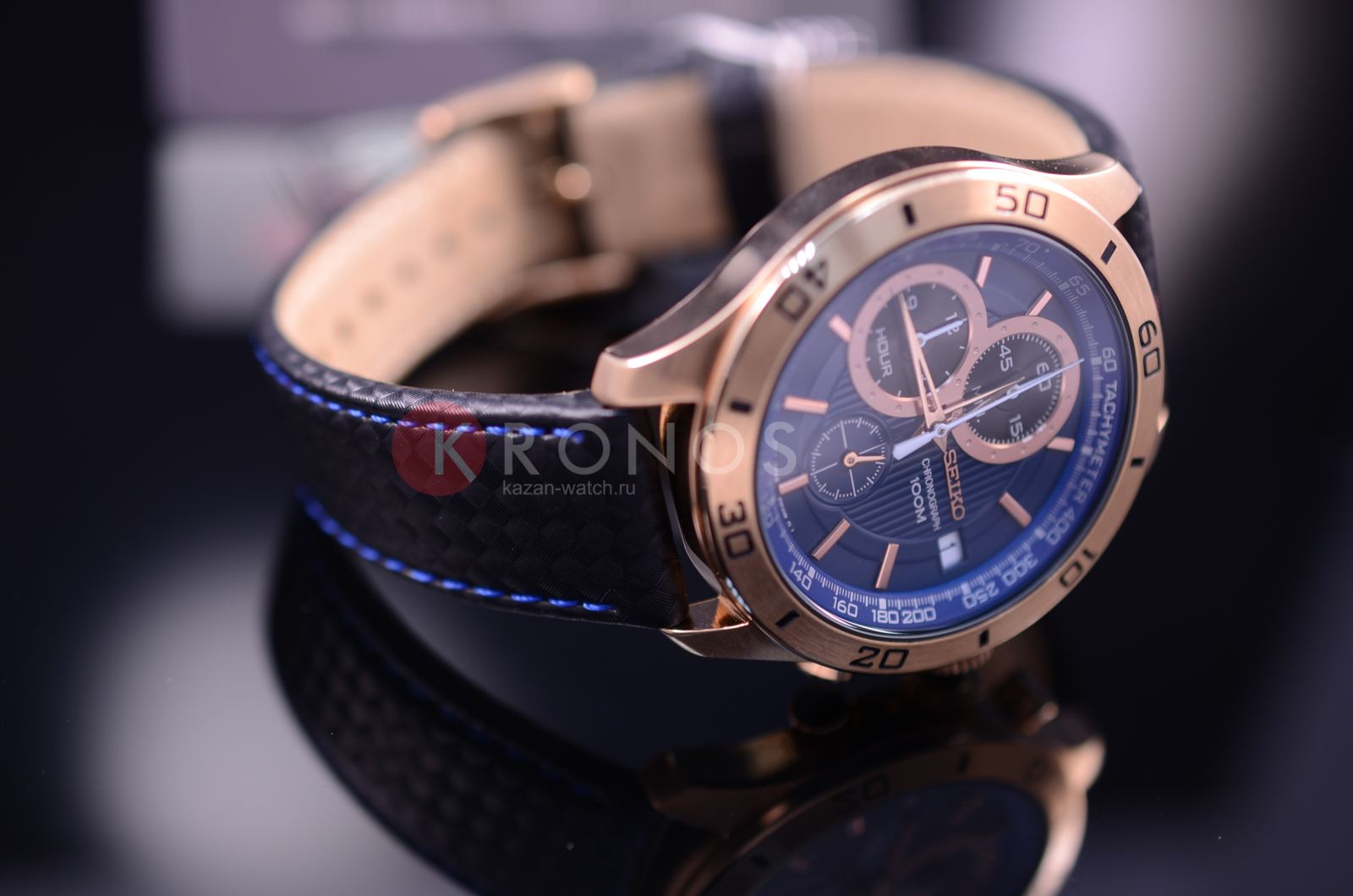 Успешные люди, желающие идти в ногу со временем, выбирают инновационные и надежные часы марки Seiko. Кварцевый механизм, калибр Seiko  8T67. Корпус круглой формы выполнен из высокопрочной стали с антикоррозийными свойствами с PVD покрытием. Синий фон циферблата с позолоченными элементами дизайна. Часы снабжены минеральным стеклом, устойчивым к царапинам. Водонепроницаемость до 100 метров. Часы прочно удерживаются на руке ремешком из натуральной кожи синего цвета. Часы оснащены хронографом и тахиметром.