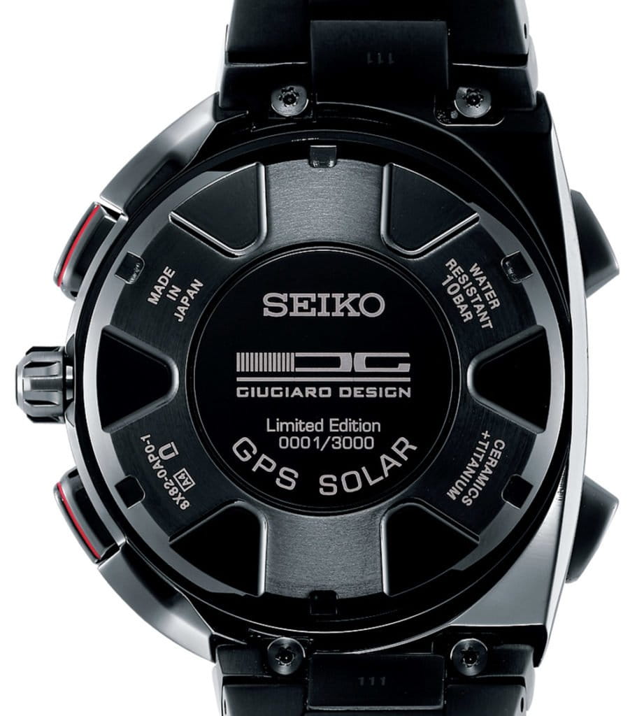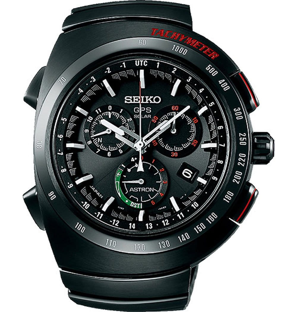 Astron Giugiaro Design Limited Edition. Лимитированная серия - 3000 экземпляров. Часы со встроенным GPS-приемником определяют часовой пояс, дату и точное время. Питание от солнечной энергии, индикатор уровня зарядки батареи. Функция сохранения энергии. Запас хода при полной зарядке аккумулятора 6 месяцев, при включенной функции сохранения энергии - 2 года. Ручная и автоматическая корректировка времени и часового пояса. Установка летнего времени. Функции приема GPS-сигнала: режим ''В полете'', показ количества спутников, показ результата последнего приема, проверка установленного часового пояса, автоматический прием информации о секунде координации. Мировое время - часы распознают все 39 часовых поясов. Второй часовой пояс в 24-х часовом формате. Ретроградный индикатор отображает: состояние зарядки батареи, режим ''В полете'', включение/отключение летнего времени, способ приема GPS-сигнала. Часы-хронограф с секундомером и тахиметром. Секундомер до 6ч, точностью 1/5с. Керамический безель. Браслет с раскладывающейся застежкой. Застежка с системой блокировки.