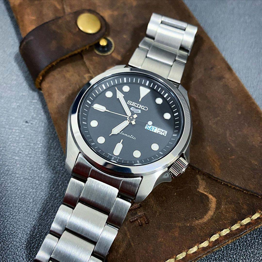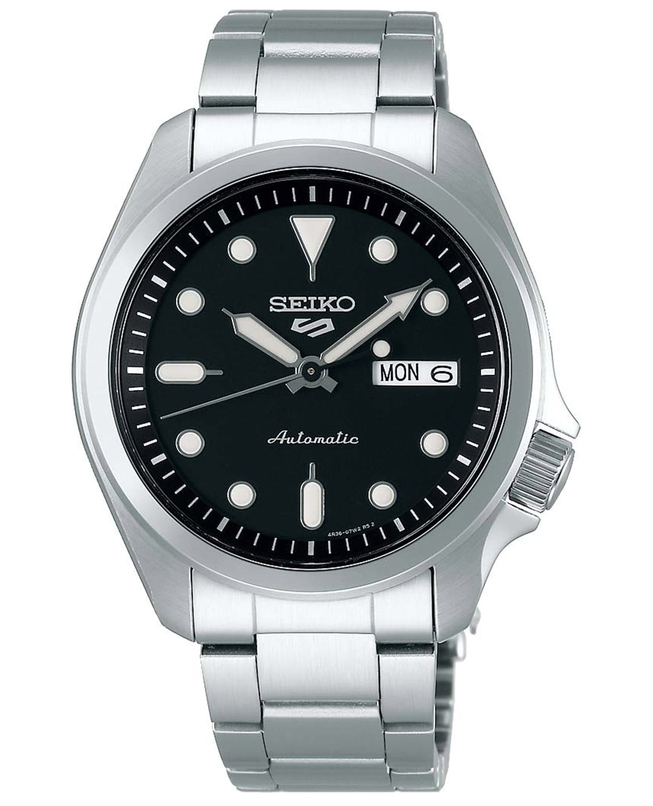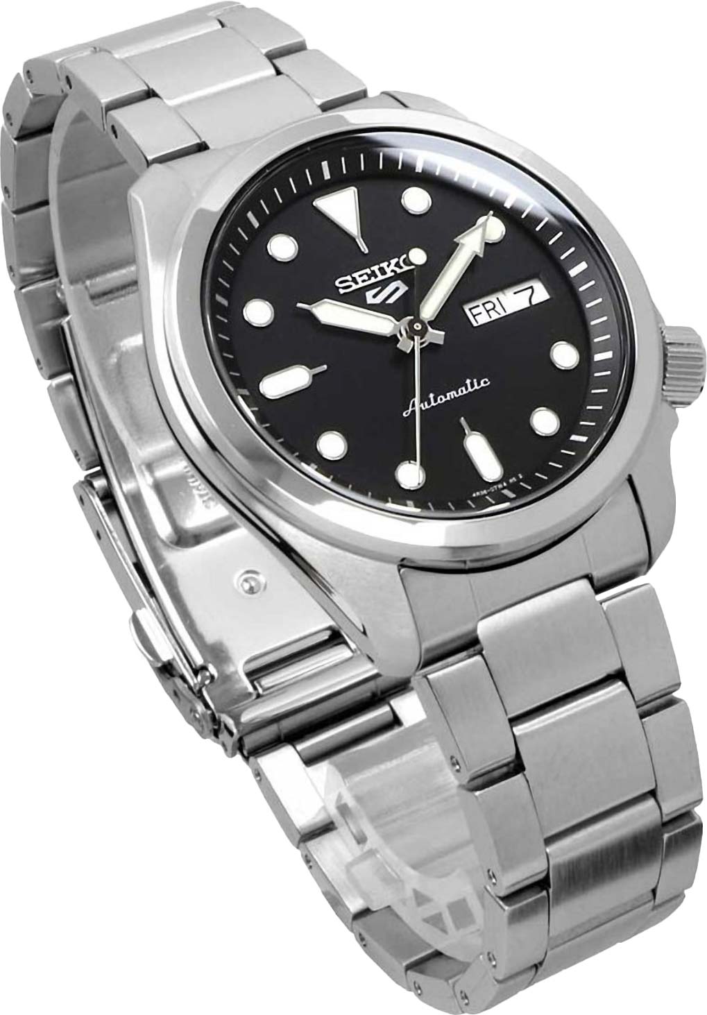 Мужские механические японские наручные часы Seiko 5 Sports SRPE55K1, механический механизм (автоматический калибр) с высокой точностью. Класс водозащиты: 100 метров, позволит плавать, нырять и заниматься другими водными видами спорта. Корпус часов изготовлен из стали. Окошки дня недели и даты находятся в положении 3 часа. Стрелки и метки с люминесцентным покрытиемЛюминесцентное покрытиеПозволяет считывать показания времени в темноте. Производители наносят на стрелки, часовые индексы, безель или поверхность циферблата светонакопительный состав, дающий холодное свечение.. Стальной браслет на раскладной застёжкеРаскладная застёжкаТакой тип застёжки используется только на браслетах из металла. Она никогда не раскрывается полностью, происходит разделение на 2 и более частей. Раскладывающая застёжка снизит вероятность потери часов к минимуму..