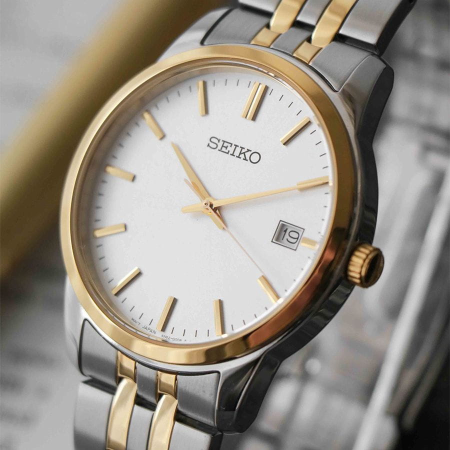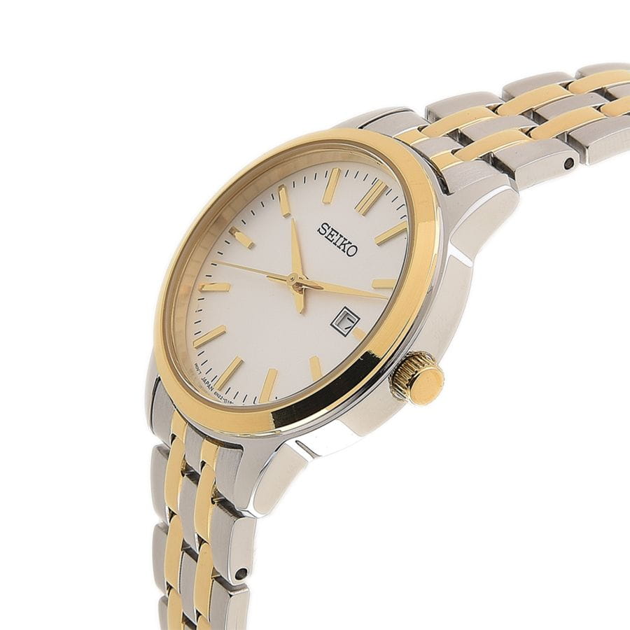Женские японские часы Seiko Discover More SUR410P1 c кварцевым механизмом с высокой точностью с калибром 6N22. Минеральное стеклоМинеральное стеклоМинеральное стекло представляет собой искусственно выращенный минерал кварца. Такое стекло отличается особой устойчивостью к повреждениям и царапинам. Уступает по некоторым качествам сапфировому стеклу. с повышенной прочностью Hardlex устойчивое к появлению царапин, обладающее высокой прозрачностью. Водозащита до 5 ATM позволяет не снимать часы при дожде, мытье рук или случайных брызгах. Корпус диаметром 30 мм и браслет изготовлены из нержавеющей стали с PVDPVDУльтратонкое покрытие наносится в технике вакуумного напыления, сочетает в себе нитрид титана особой прочности со слоем золота или оксида хрома. Несёт в себе декоративную или защитную функцию. покрытием. Браслет с раскладной застёжкойРаскладная застёжкаТакой тип застёжки используется только на браслетах из металла. Она никогда не раскрывается полностью, происходит разделение на 2 и более частей. Раскладывающая застёжка снизит вероятность потери часов к минимуму. с фиксатором. Белый циферблат с метками в виде штрихов, окошко с датой находится в позиции 3 часов. Seiko — это гармония изящного дизайна и технологичной надёжности, компактный и стильный выбор для повседневной классики.