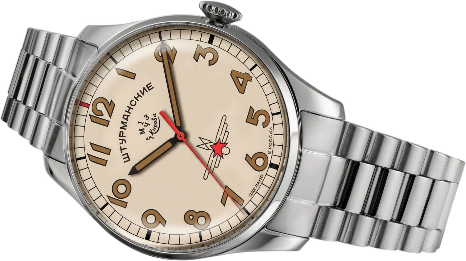 Штурманские мужские российские механические часы 2416/3905146B с механизмом высокой точности. Класс водозащиты: 50 метров, позволит защитить корпус от случайных брызг или капель дождя. Корпус часов изготовлен из стали. Минеральное стеклоМинеральное стеклоМинеральное стекло представляет собой искусственно выращенный минерал кварца. Такое стекло отличается особой устойчивостью к повреждениям и царапинам. Уступает по некоторым качествам сапфировому стеклу. устойчивое к мелким механическим повреждениям. Стальной браслет с раскладной застёжкойРаскладная застёжкаТакой тип застёжки используется только на браслетах из металла. Она никогда не раскрывается полностью, происходит разделение на 2 и более частей. Раскладывающая застёжка снизит вероятность потери часов к минимуму.. Стрелки и метки с люминесцентным покрытиемЛюминесцентное покрытиеПозволяет считывать показания времени в темноте. Производители наносят на стрелки, часовые индексы, безель или поверхность циферблата светонакопительный состав, дающий холодное свечение.. Задняя крышка украшена портретом Юрия Гагарина и крепится на 4-х винтах.