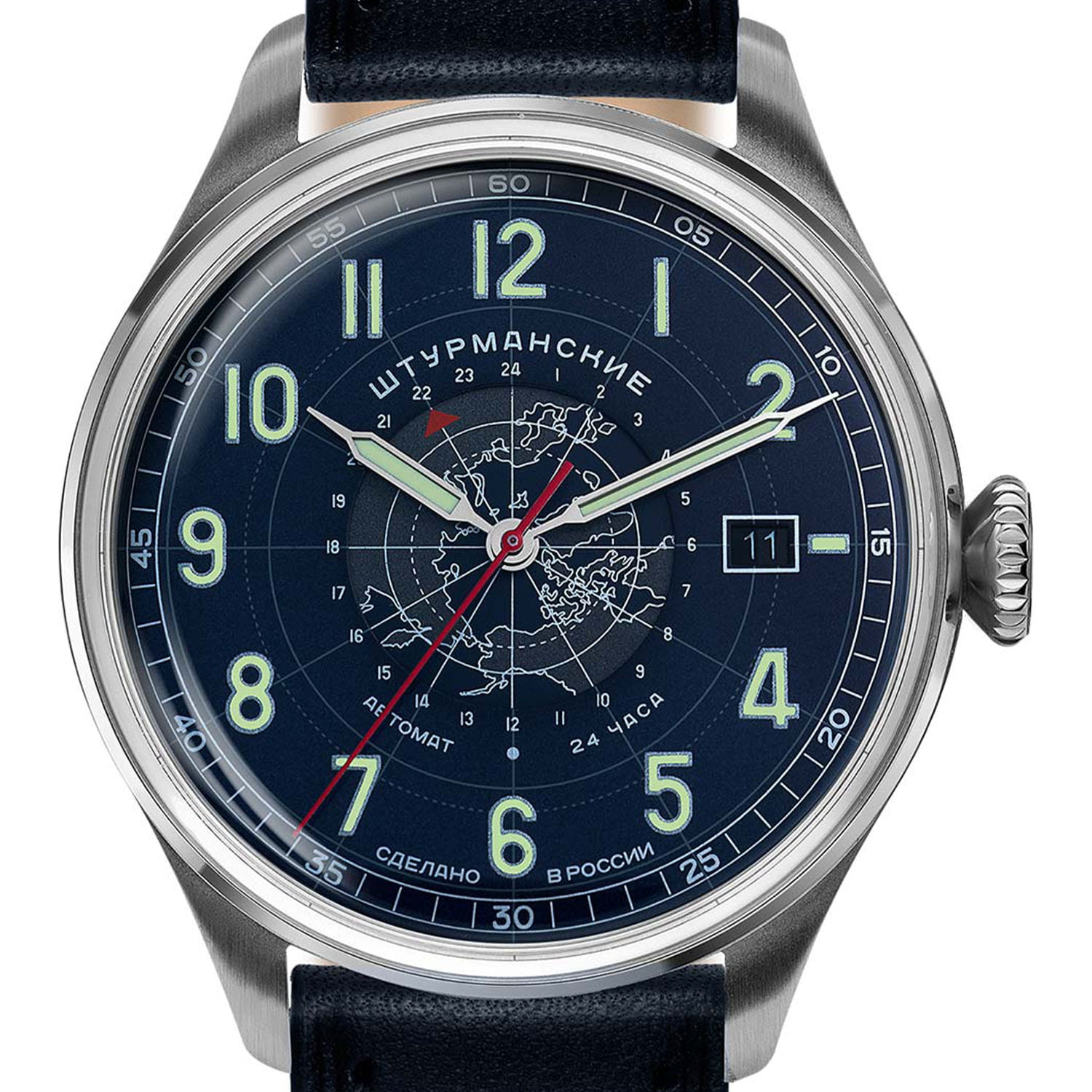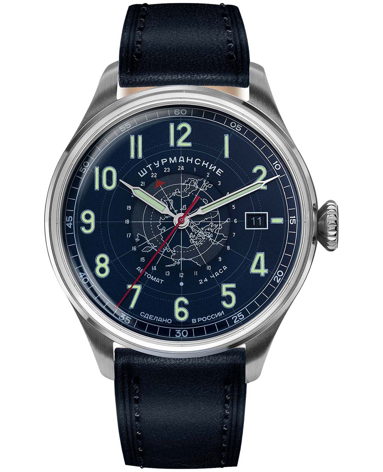 Штурманские мужские российские механические часы Штурманские Наследие Арктика День-Ночь 2432/6821352, механический механизм (автоматический калибр) с высокой точностью. Класс водозащиты: 30 метров, позволит защитить корпус от случайных брызг или капель дождя. Корпус часов изготовлен из стали. Кожаный ремешок на стандартной застёжке. Стрелки и метки с люминесцентным покрытиемЛюминесцентное покрытиеПозволяет считывать показания времени в темноте. Производители наносят на стрелки, часовые индексы, безель или поверхность циферблата светонакопительный состав, дающий холодное свечение. отлично видны даже в темноте, а две временные шкалы позволяют жить сразу в двух часовых поясах. У модели проверенный временем отечественный механизм с автоматическим заводом. Калибр Восток 2432 отличается надежностью, противоударной защитой, запасом хода 33 часа, точностью (погрешность не более 20-60 секунд в сутки).