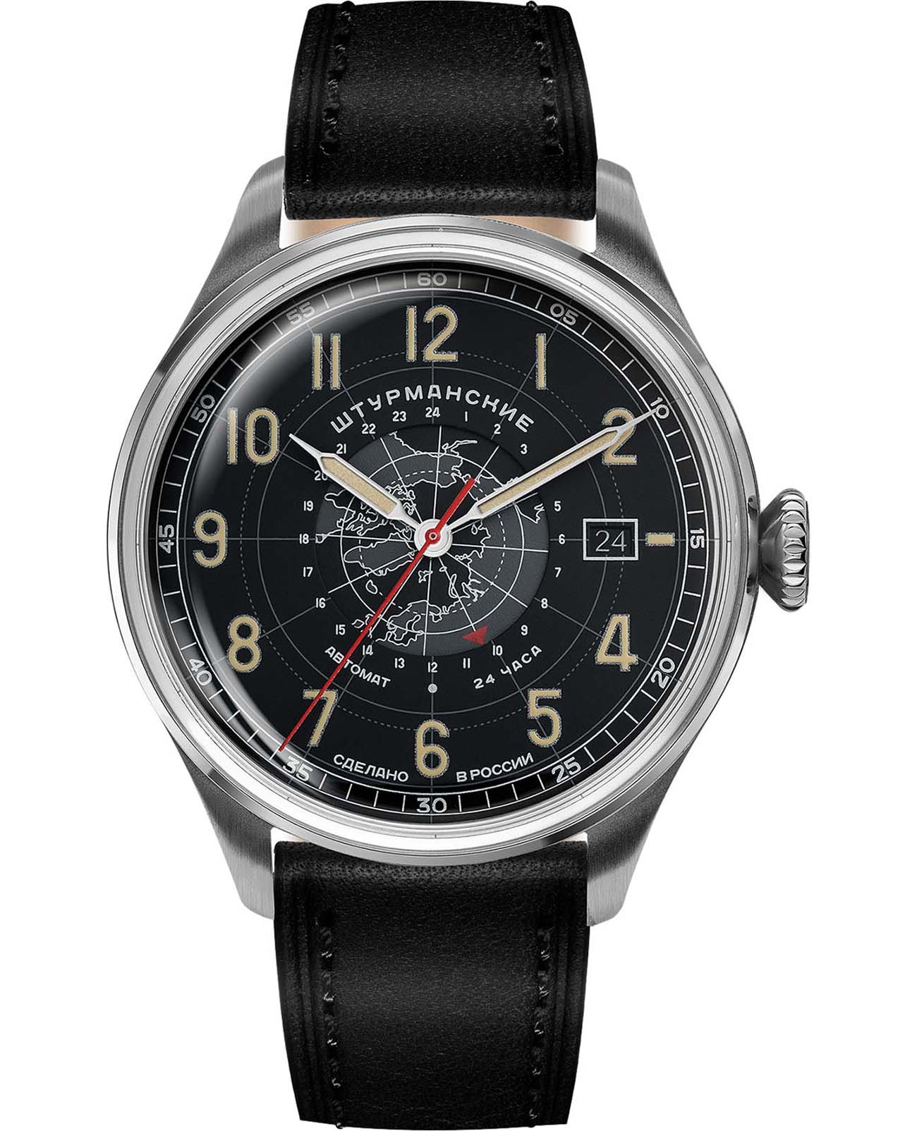 Штурманские мужские российские механические часы с механизмом высокой точности. Класс водозащиты: 30 метров, позволит защитить корпус от случайных брызг или капель дождя. Корпус часов изготовлен из стали. Органическое стекло устойчивое к мелким механическим повреждениям. Кожаный ремешок на стандартной застёжке. Стрелки и метки с люминесцентным покрытиемЛюминесцентное покрытиеПозволяет считывать показания времени в темноте. Производители наносят на стрелки, часовые индексы, безель или поверхность циферблата светонакопительный состав, дающий холодное свечение.. Окошко даты находится в положении 3 часа. Задняя крышка украшена картой Арктики.