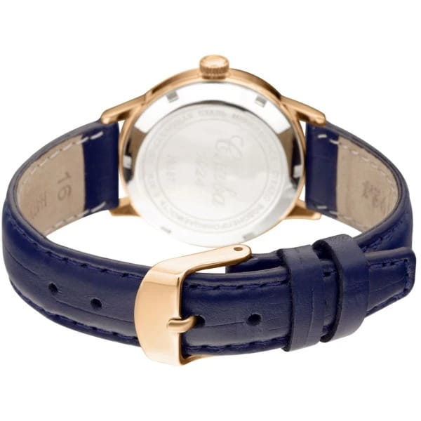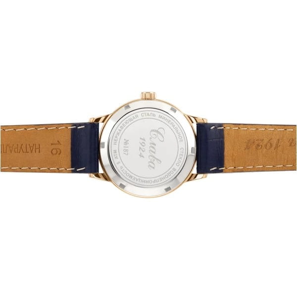 Российские механические наручные часы Слава 1873096/300-6Т15 станут стильным и надежным аксессуаром для вашего образа. Эти элегантные часы созданы с акцентом на высокое качество и изысканный дизайн. Оборудованные механизмом Miyota 6T15 с автоподзаводом, они обеспечивают точность и надежность, поддерживая запас хода до 40 часов. Часы заключены в прочный стальной корпус с IP-покрытиемIP-покрытиеМетод ионного напыления. Демонстрирует повышенную устойчивость к истиранию, окислению и химическим веществам. Под воздействием высокого давления и температуры около 1500°C молекулы металла надёжно соединяются с частицами корпуса часов. диаметром 32 мм и минеральным стекломМинеральное стеклоМинеральное стекло представляет собой искусственно выращенный минерал кварца. Такое стекло отличается особой устойчивостью к повреждениям и царапинам. Уступает по некоторым качествам сапфировому стеклу., что обеспечивает надежную защиту и долговечность. Синий циферблат украшен изображением герба Российской Федерации и автографом В.В. Путина. Широкие заостренные стрелки в стиле Baton и штриховые метки придают циферблату выразительность и читаемость. Часы оснащены календарем с окошком даты на 3 часах, что делает их еще более функциональными. Рифленая заводная головка и завинчивающаяся задняя крышка добавляют изделию надежности и комфорта в использовании. Завершает образ текстурированный кожаный ремешок синего цвета с классической застежкой, который обеспечивает удобную посадку на запястье. Благодаря водозащите до 50WR, эти часы подойдут для повседневного использования, сохраняя свой безупречный вид и функциональность.