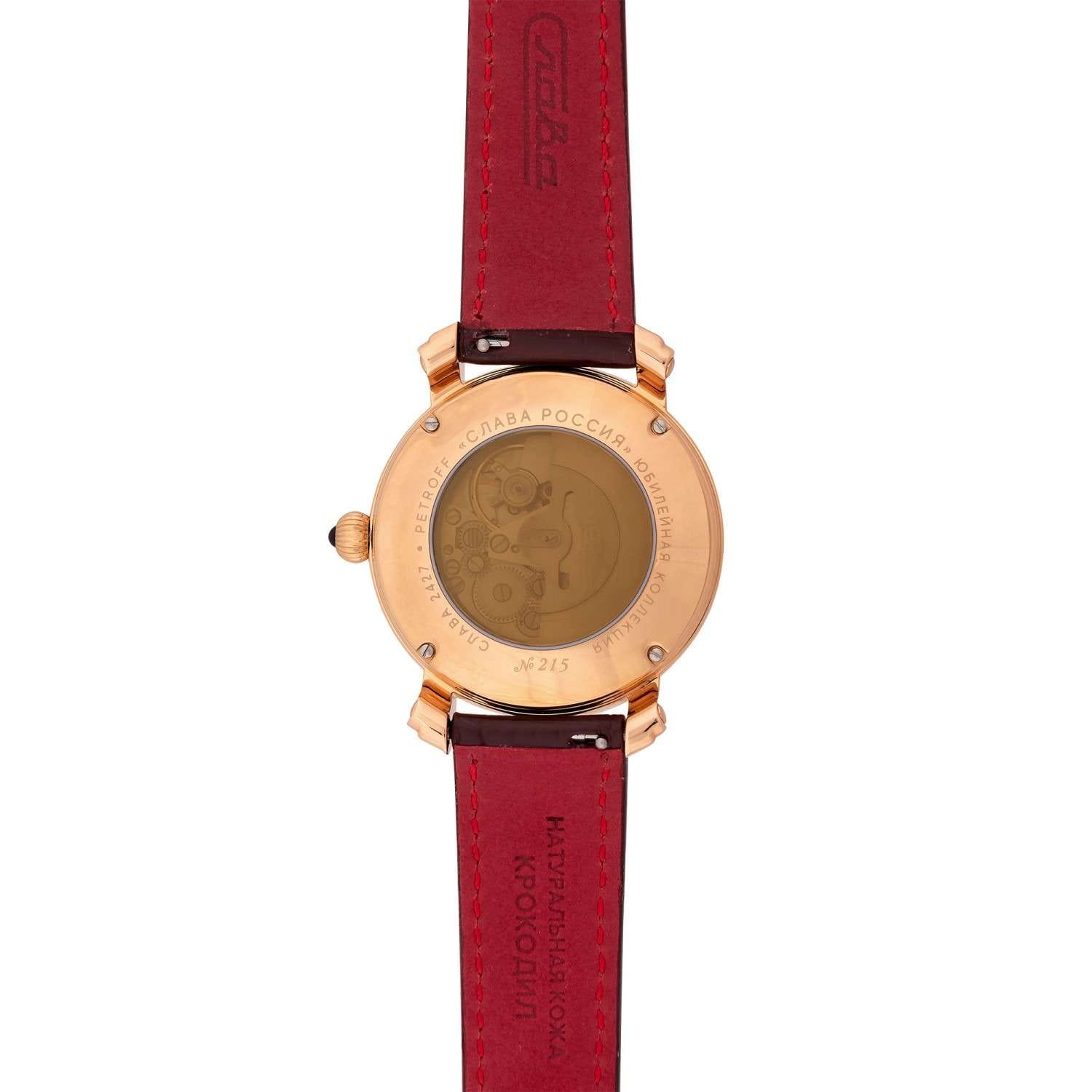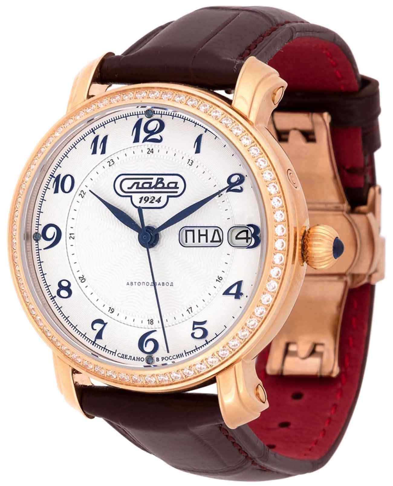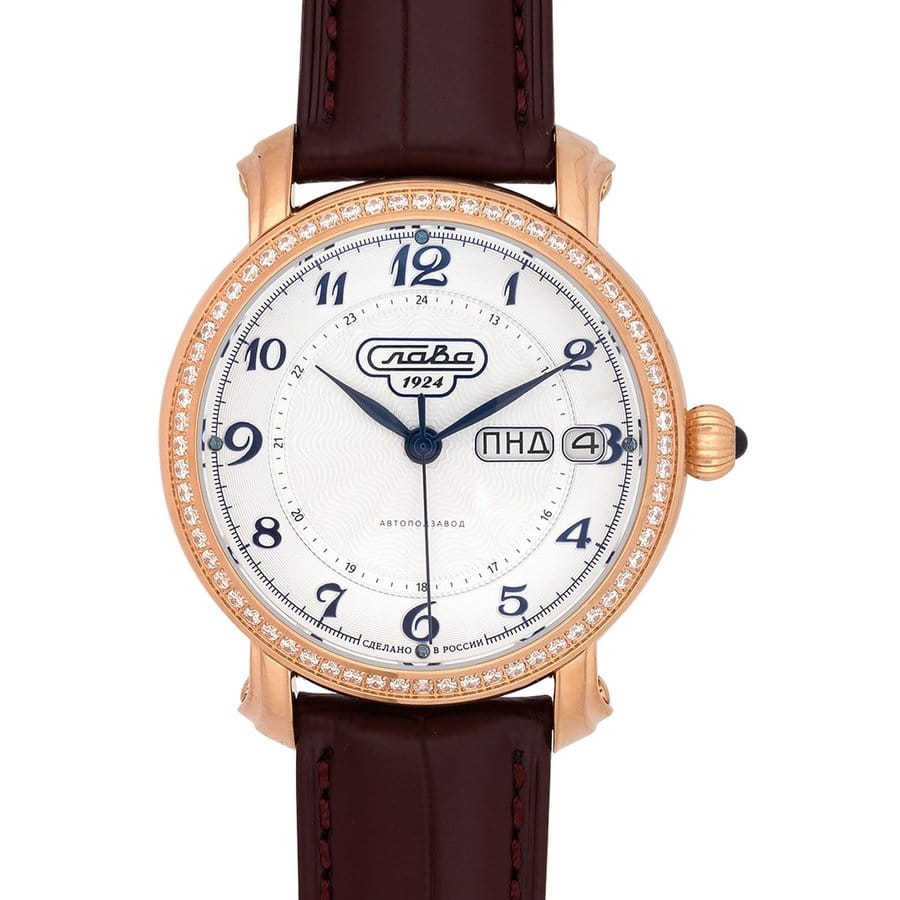 Наручные часы Слава Слава России 7443615/300-2427-68 — воплощение классического стиля и исключительного качества, произведенные в России. Эта модель из лимитированной коллекции станет великолепным дополнением к вашему образу. Часы оснащены надежным механическим механизмом "Слава 2427" с автоподзаводом, обеспечивающим точный ход и оснащены двойным календарем, что позволяет всегда быть в курсе текущей даты. Корпус из нержавеющей стали с золотистым PVDPVDУльтратонкое покрытие наносится в технике вакуумного напыления, сочетает в себе нитрид титана особой прочности со слоем золота или оксида хрома. Несёт в себе декоративную или защитную функцию.-покрытием диаметром 41 мм и толщиной 14,2 мм отличается высокой прочностью и водозащитой до 5 ATM. БезельБезельВнешний ободок, закрепляющий стекло. В спортивных часах так называется поворотное кольцо с делениями на циферблате, выполняет роль таймера – замеряет отрезки времени на шкале. Неподвижный безель – элемент декора. Однонаправленно вращающийся безель на дайверских часах позволяет фиксировать моменты погружения и выныривания на поверхность. часов с вставками из камней циркона. Серебристый циферблат с арабскими цифрами защищен сапфировым стекломСапфировое стеклоПрочный и надёжный материал из кристалла сапфира синтетического происхождения, характеризующийся особой твёрдостью и устойчивостью к царапинам и повреждениям., устойчивым к царапинам, что позволяет надолго сохранить безупречный вид часов. На 3 часах расположено окошко с указателем даты и дня недели. Кожаный ремень из крокодила с застежкой «бабочка»Застёжка "бабочка"Такой вид застёжки дополняется предохранителями, помогающими избежать случайного раскрытия браслета. Обладают изящным исполнением. добавляет элегантности и комфорта, создавая ощущение роскоши и изысканности. Эта модель станет идеальным выбором для тех, кто ценит традиции и высокое качество в сочетании с современным дизайном.