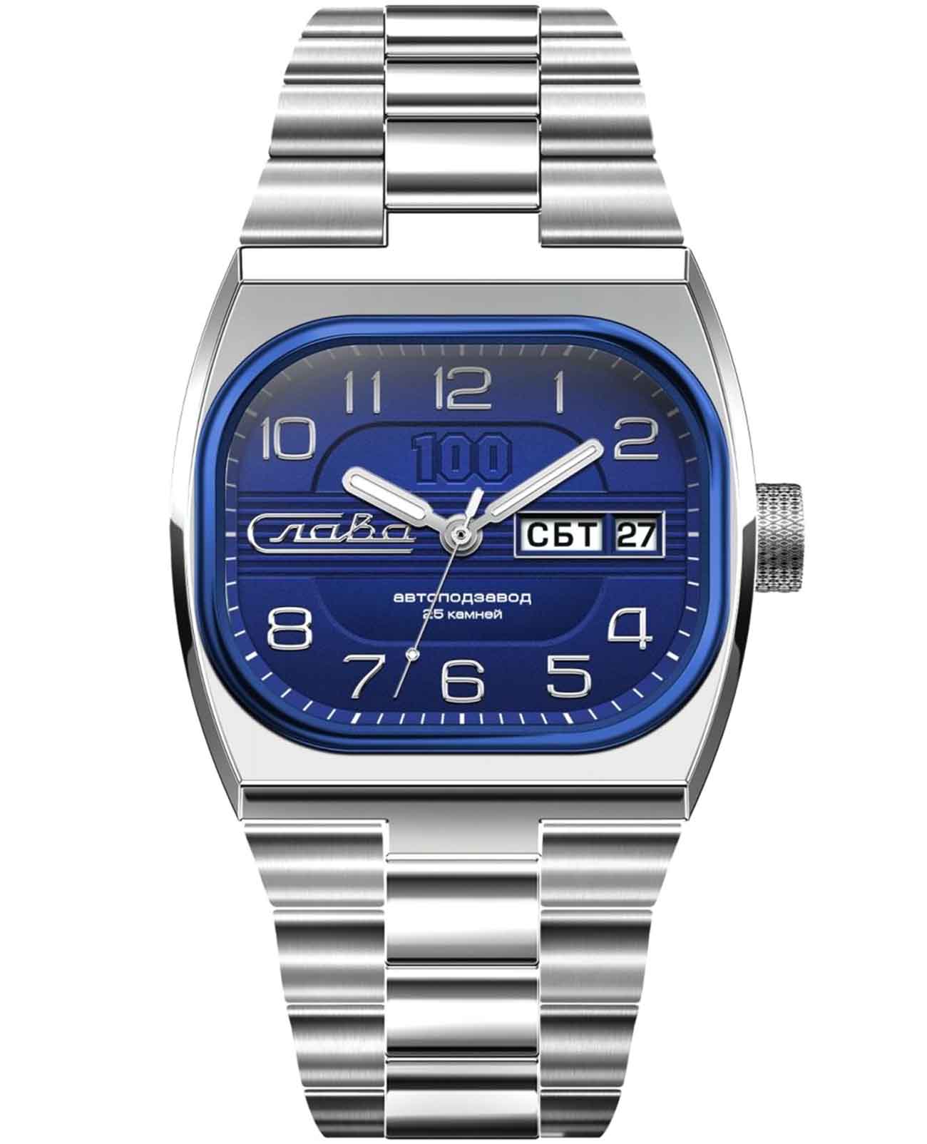 Российские часы Слава Телевизор 9047566/100-2427 оснащены механизмом Слава 2427, что обеспечивает исключительную надежность и точность хода. Корпус и браслет часов выполнены из стали, что придает им долговечность и устойчивость к внешним воздействиям. Сапфировое стеклоСапфировое стеклоПрочный и надёжный материал из кристалла сапфира синтетического происхождения, характеризующийся особой твёрдостью и устойчивостью к царапинам и повреждениям., которое еще и граненое, защищает ярко-синий циферблат от царапин. Водозащита уровня 100WR позволяет использовать часы в различных условиях. Эти часы идеально подойдут для повседневного использования, сочетая в себе стиль, надежность и функциональность. Стрелки с люминесцентным покрытиемЛюминесцентное покрытиеПозволяет считывать показания времени в темноте. Производители наносят на стрелки, часовые индексы, безель или поверхность циферблата светонакопительный состав, дающий холодное свечение., что облегчает чтение времени даже в условиях слабого освещения. Окошки дня недели и даты находятся в положении 3 часа. Стальной браслет на застежке «бабочка»Застёжка "бабочка"Такой вид застёжки дополняется предохранителями, помогающими избежать случайного раскрытия браслета. Обладают изящным исполнением. обеспечивает комфортное и надёжное крепление на запястье. Лимитированная серия ограничена 500 экземплярами, что подчеркивает их уникальность. Эти часы станут надежным спутником в вашей повседневной жизни.