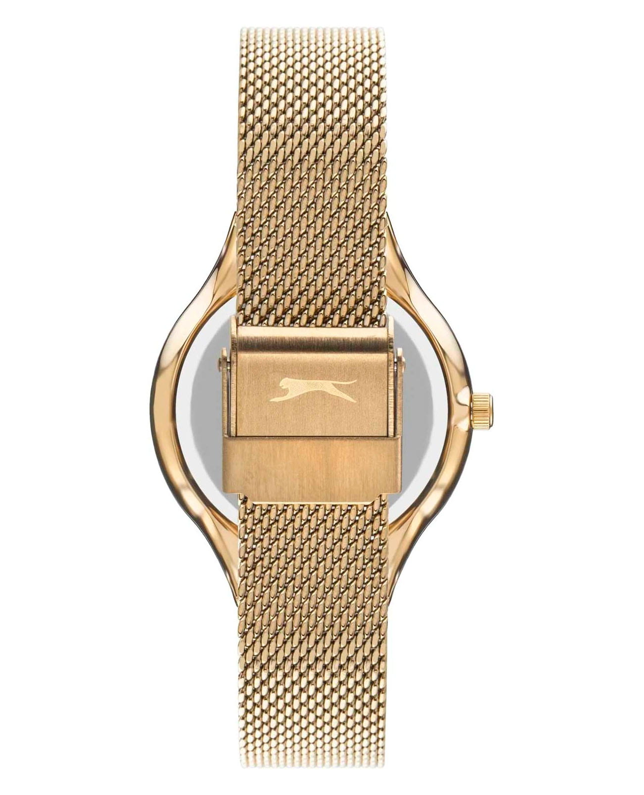 Женские наручные часы Slazenger SL.09.2015.3.03 сочетают в себе элегантный дизайн и надежность современных технологий. Модель обладает круглым корпусом диаметром 35 мм, изготовленным из суперметалла с IP-покрытиемIP-покрытиеМетод ионного напыления. Демонстрирует повышенную устойчивость к истиранию, окислению и химическим веществам. Под воздействием высокого давления и температуры около 1500°C молекулы металла надёжно соединяются с частицами корпуса часов., что обеспечивает высокую устойчивость к внешним воздействиям. Браслет выполнен в виде миланского плетения из того же материала с раскладным замкомРаскладной замокДанный вариант застежки используется только на часах с металлическим браслетом. Отличительная особенность такого крепления в том, что длина браслета становится универсальной и вы можете самостоятельно отрегулировать нужный вам размер – застежка просто двигается по браслету часов., гарантируя комфортное ношение и стильный внешний вид. Циферблат украшен индексами и кристаллами, а также оснащен тремя стрелками для показания часов, минут и секунд. Для защиты применяется минеральное стеклоМинеральное стеклоМинеральное стекло представляет собой искусственно выращенный минерал кварца. Такое стекло отличается особой устойчивостью к повреждениям и царапинам. Уступает по некоторым качествам сапфировому стеклу., обеспечивающее прочную защиту от царапин. Часы работают на японском кварцевом механизме, что гарантирует точное время без необходимости подзаводки. Водонепроницаемость часов достигает 5 атмосфер (50 метров), что позволяет использовать их при контакте с водой, например, во время мытья рук или попадания брызг, однако не рекомендуется для плавания.