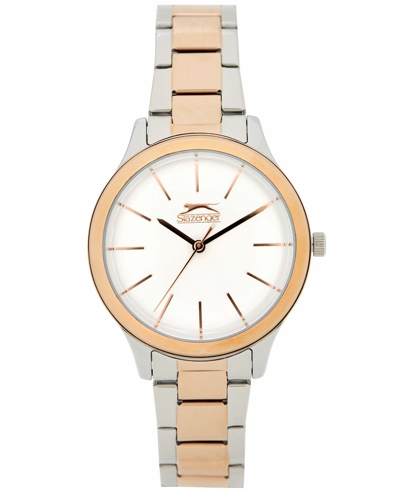 Часы Slazenger SL.09.2101.3.04 станут элегантным дополнением вашего образа. Изящный серебристый циферблат заключен в серебристый корпус диаметром 36 мм, выполненный из прочного суперметалла и безельБезельВнешний ободок, закрепляющий стекло. В спортивных часах так называется поворотное кольцо с делениями на циферблате, выполняет роль таймера – замеряет отрезки времени на шкале. Неподвижный безель – элемент декора. Однонаправленно вращающийся безель на дайверских часах позволяет фиксировать моменты погружения и выныривания на поверхность. цвета розового золота из суперметалла с IP-покрытиемIP-покрытиеМетод ионного напыления. Демонстрирует повышенную устойчивость к истиранию, окислению и химическим веществам. Под воздействием высокого давления и температуры около 1500°C молекулы металла надёжно соединяются с частицами корпуса часов.. Эти женские часы оснащены надежным кварцевым механизмом и защищены от воды на уровне 3 АТМ, что делает их подходящими для повседневного использования. Серебристый браслет из суперметалла с частичным IP-покрытиемIP-покрытиеМетод ионного напыления. Демонстрирует повышенную устойчивость к истиранию, окислению и химическим веществам. Под воздействием высокого давления и температуры около 1500°C молекулы металла надёжно соединяются с частицами корпуса часов. цвета розового золота и с раскладной застёжкойРаскладная застёжкаТакой тип застёжки используется только на браслетах из металла. Она никогда не раскрывается полностью, происходит разделение на 2 и более частей. Раскладывающая застёжка снизит вероятность потери часов к минимуму. обеспечивает комфортное прилегание на запястье. Минеральное стеклоМинеральное стеклоМинеральное стекло представляет собой искусственно выращенный минерал кварца. Такое стекло отличается особой устойчивостью к повреждениям и царапинам. Уступает по некоторым качествам сапфировому стеклу. гарантирует защиту от царапин.