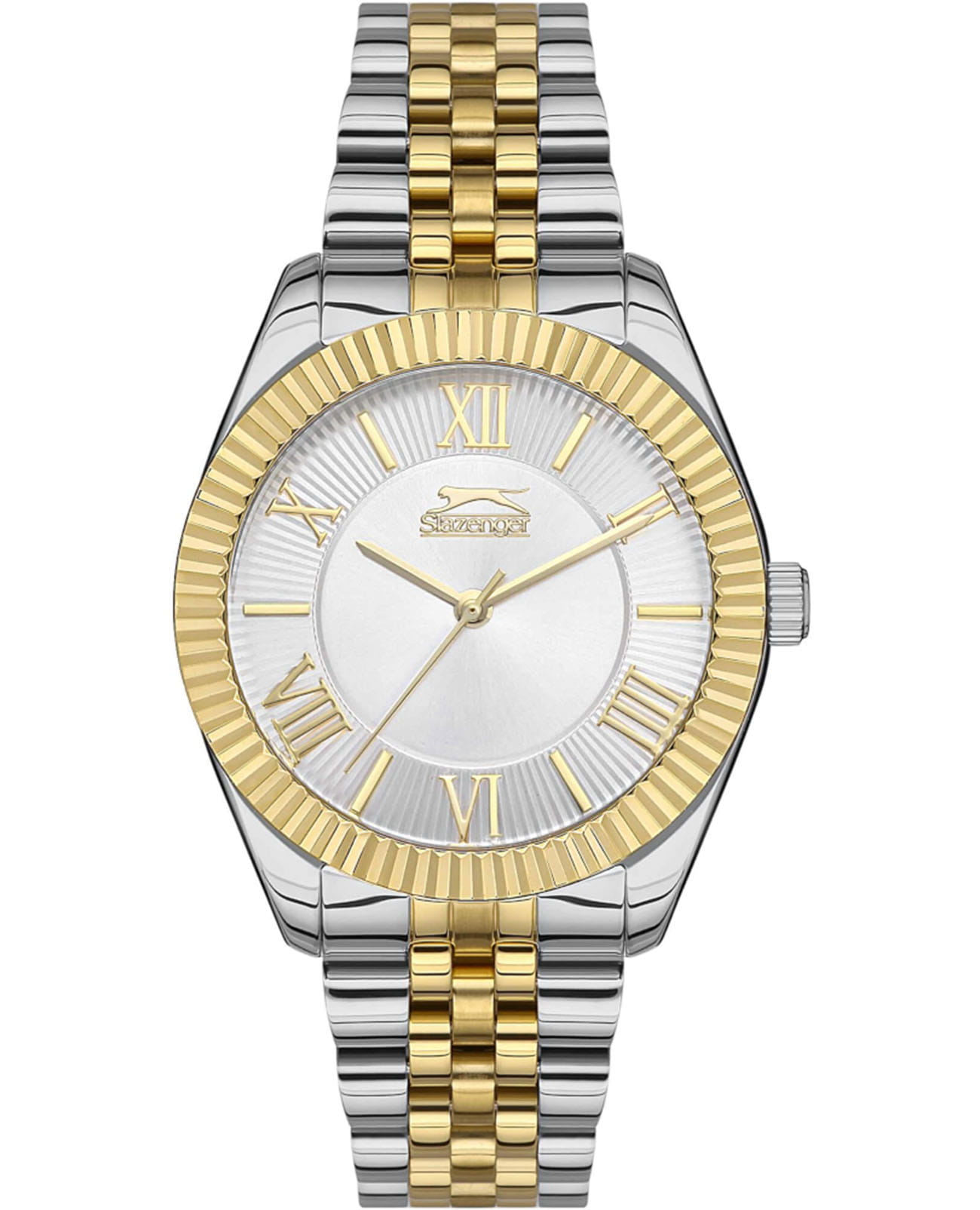 Женские кварцевые часы Slazenger SL.09.2150.3.02 — это стильный и элегантный аксессуар с корпусом из суперметалла с IP-покрытиемIP-покрытиеМетод ионного напыления. Демонстрирует повышенную устойчивость к истиранию, окислению и химическим веществам. Под воздействием высокого давления и температуры около 1500°C молекулы металла надёжно соединяются с частицами корпуса часов.. Корпус круглой формы защищён минеральным стекломМинеральное стеклоМинеральное стекло представляет собой искусственно выращенный минерал кварца. Такое стекло отличается особой устойчивостью к повреждениям и царапинам. Уступает по некоторым качествам сапфировому стеклу.. Циферблат серебристого цвета оформлен римскими цифрами и метками, придающими модели классический вид. Браслет из суперметалла комбинированного цвета — серебристого и золотистого — фиксируется на раскладной застёжкеРаскладная застёжкаТакой тип застёжки используется только на браслетах из металла. Она никогда не раскрывается полностью, происходит разделение на 2 и более частей. Раскладывающая застёжка снизит вероятность потери часов к минимуму., обеспечивая удобство и надёжность ношения. Часы сочетают в себе современный дизайн и надёжность, идеально подходя для повседневного и делового образа. Водонепроницаемость 30 м позволяет использовать их в повседневных условиях, защищая от случайных брызг и капель дождя.