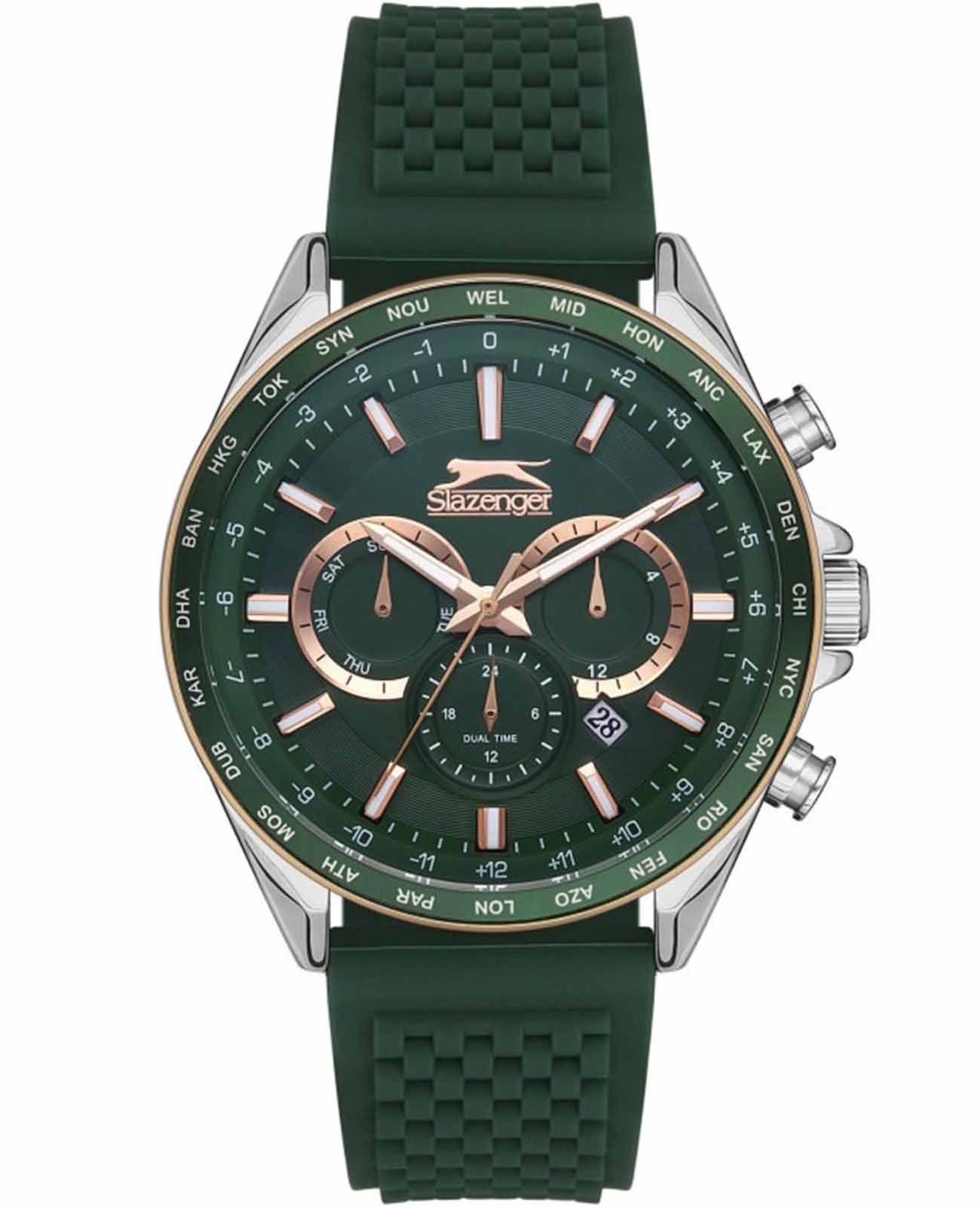 Мужские наручные часы Slazenger SL.09.2179.2.04 — стильный аксессуар с ярко выраженными спортивными чертами, который станет надежным спутником в повседневной жизни. Эти часы оснащены кварцевым механизмом, обеспечивающим высокую точность хода. Металлический корпус в сочетании с зеленым силиконовый ремешком на классической застежке шириной 22 мм создает гармоничный и современный образ. Диаметр корпуса составляет 45 мм, а толщина — 11 мм, что придает часам стильный и выразительный вид. БезельБезельВнешний ободок, закрепляющий стекло. В спортивных часах так называется поворотное кольцо с делениями на циферблате, выполняет роль таймера – замеряет отрезки времени на шкале. Неподвижный безель – элемент декора. Однонаправленно вращающийся безель на дайверских часах позволяет фиксировать моменты погружения и выныривания на поверхность. с зеленым IP-покрытиемIP-покрытиеМетод ионного напыления. Демонстрирует повышенную устойчивость к истиранию, окислению и химическим веществам. Под воздействием высокого давления и температуры около 1500°C молекулы металла надёжно соединяются с частицами корпуса часов., что придает ему дополнительную прочность и устойчивость к износу. Минеральное стеклоМинеральное стеклоМинеральное стекло представляет собой искусственно выращенный минерал кварца. Такое стекло отличается особой устойчивостью к повреждениям и царапинам. Уступает по некоторым качествам сапфировому стеклу. защищает циферблат от царапин и внешних воздействий, а водозащита уровня WR 50 позволяет не беспокоиться о случайных контактах с водой, будь то дождь или мытье рук. Особенностью данной модели является наличие календаря, отображающего дату и день недели, а также возможность следить за временем во втором часовом поясе.  Люминесцентное покрытиеЛюминесцентное покрытиеПозволяет считывать показания времени в темноте. Производители наносят на стрелки, часовые индексы, безель или поверхность циферблата светонакопительный состав, дающий холодное свечение. на стрелках и метках обеспечивает отличную видимость в темноте.